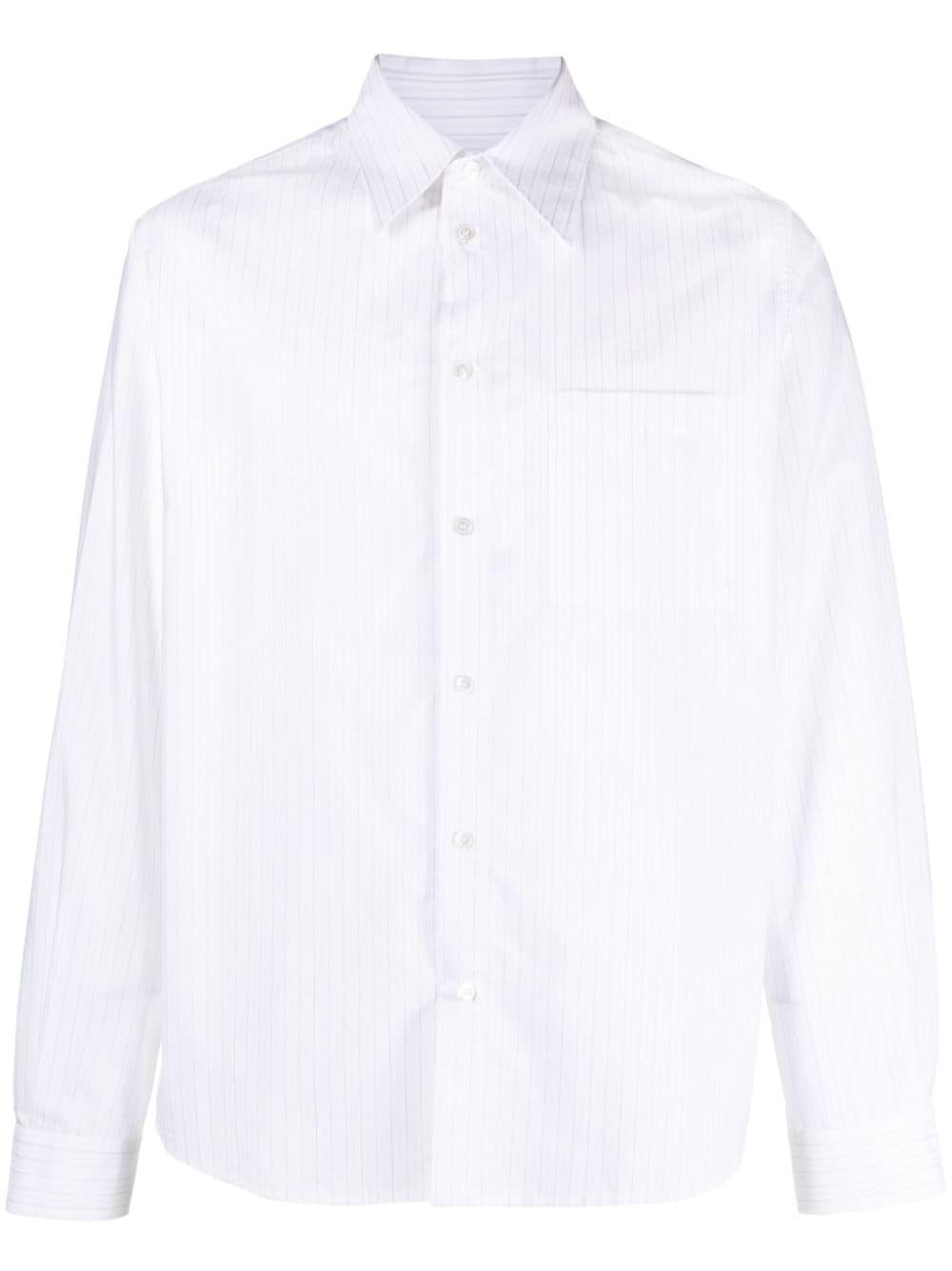 pinstriped cotton shirt Highlights - White/grey - Cotton - Poplin texture - Pinstripe pattern - Box-pleat detail - Signature numbers patch - Straight-point collar - Front button fastening - Long sleeves - Buttoned cuffs - Chest patch pocket - Rear curved hem Made in Italy Composition Cotton 100% SIZE & FIT Model measurements Height 6 ft 2 in(1.87 m) Bust/Chest 33.46 in(85 cm) Hips 36.22 in(92 cm) Waist 29.52 in(75 cm) FittingInformation Designed for a relaxed fit, this piece allows for comfort and movement when worn Made from a midweight non-stretch fabric This piece fits true to size – take your usual size Washing instructions Machine Wash