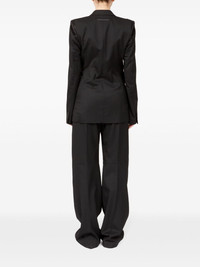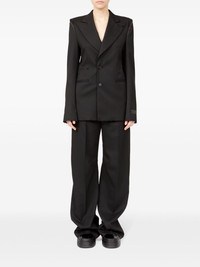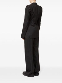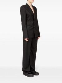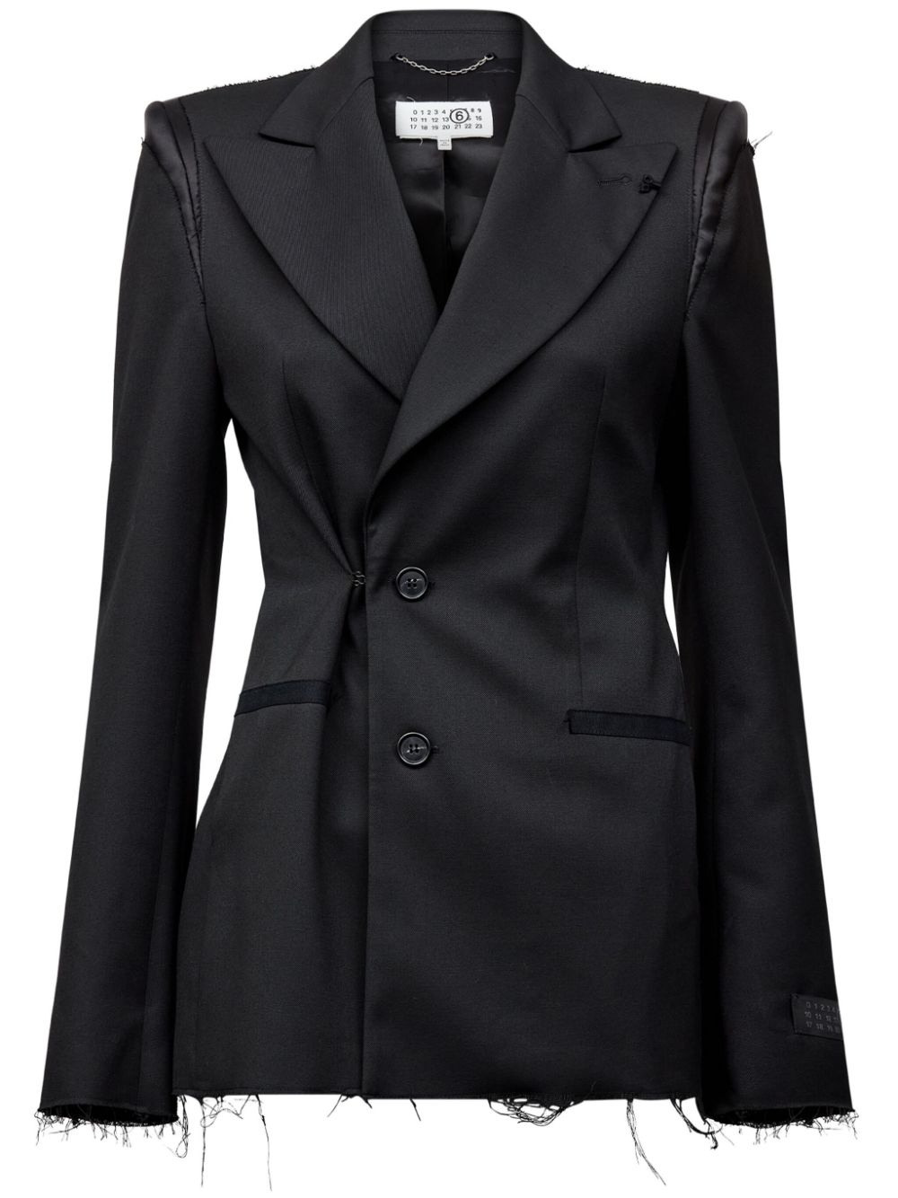 raw-cut off-centre blazer Highlights - Black - Satin trim - Stretch-design - Deconstructed design - Raw-cut edge - Signature single-stitch logo - Signature numbers motif - Wide notch lapels - Long sleeves - Off-centre front button fastening - Buttoned cuffs - Two side welt pockets - Straight hem Made in Italy Composition Polyester 69%, Viscose 30%, Spandex/Elastane 1% Washing instructions Do Not Wash/Do Not Dry Clean