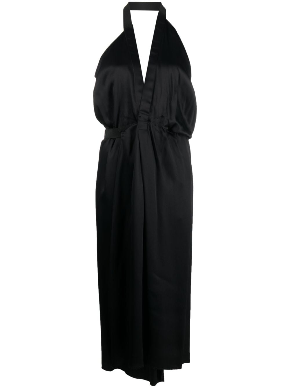 satin halterneck midi dress Highlights - Black - Satin finish - Plunging v-neck - Halterneck - Low back - Fitted waistline - Calf-length Made in Italy Composition Acetate 67%, Polyester 33% SIZE & FIT Model measurements Height 5 ft 11 in(1.8 m) Bust/Chest 31.49 in(80 cm) Hips 36.22 in(92 cm) Waist 25.59 in(65 cm) FittingInformation Designed for a loose fit at the chest with a close fit over the waist and hips The elasticated waist allows for a comfortable fit Made from a midweight non-stretch fabric This piece fits true to size – take your usual size Washing instructions Dry Clean Only