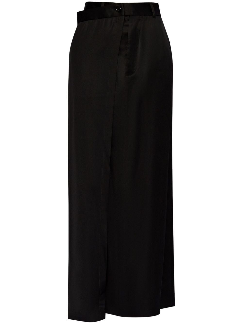 satin maxi skirt Highlights - Black - Satin finish - Front button fastening - Belt loops - Wrap design - Slip pockets to the sides - Rear tie fastening - Two rear button-fastening jetted pockets - Side slit - Floor-length - Straight hem Made in Italy Composition Viscose 100% SIZE & FIT FittingInformation This maxi-length skirt is intended to be worn just below the waist Made from a midweight non-stretch fabric This piece fits true to size – take your usual size