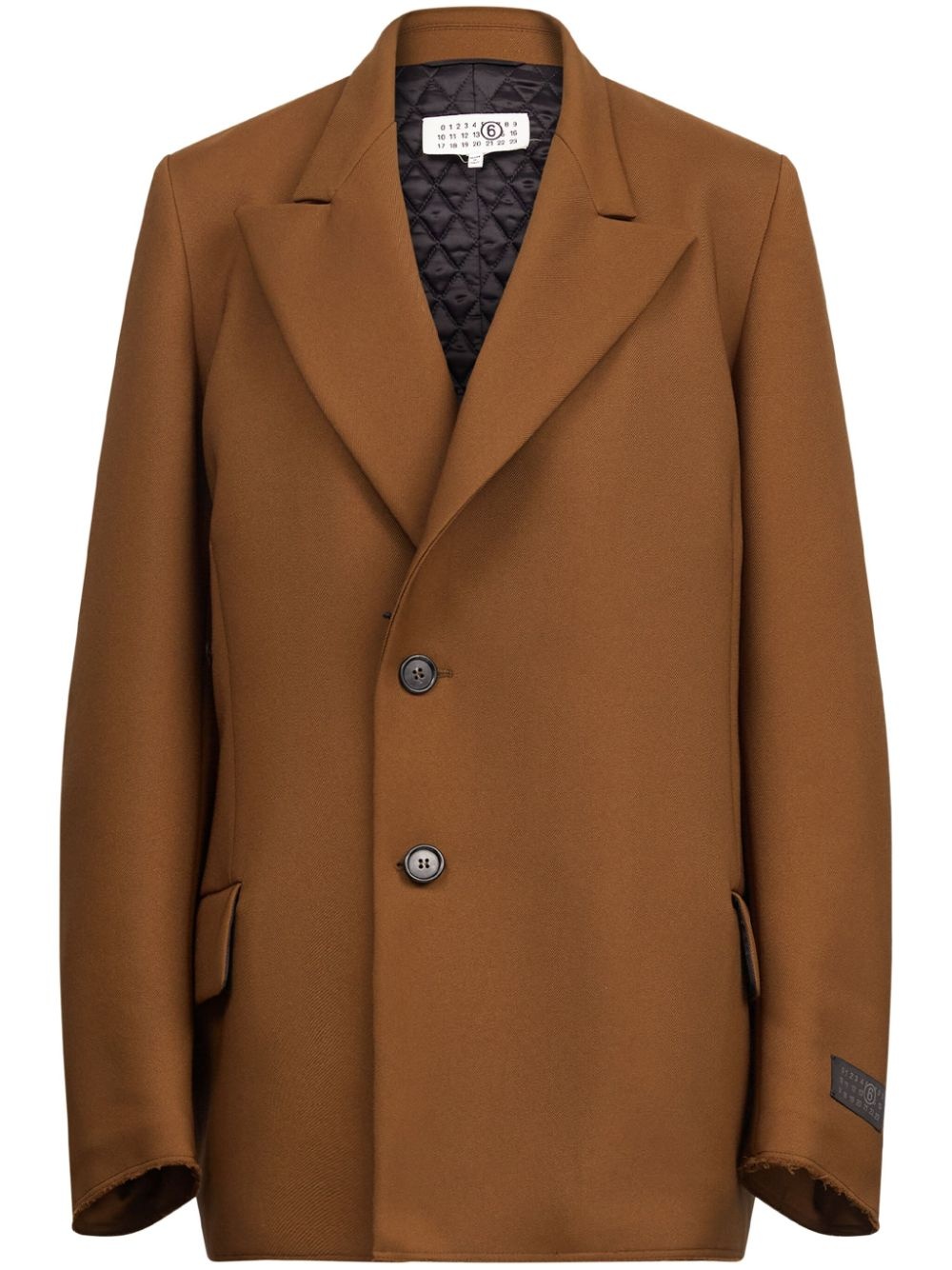 single-breasted over-sized blazer Highlights - Brown - Signature single-stitch logo - Logo patch at the sleeve - Peak lapels - Off-centre front button fastening - Two front flap pockets - Long sleeves - Buttoned cuffs - Straight hem Made in Italy Composition Polyester 100% SIZE & FIT FittingInformation Designed for an oversized fit, offering additional room throughout The internal shoulder pads offer a structured shape Made from a midweight non-stretch fabric Washing instructions Read Manufacturer Guidelines
