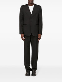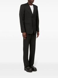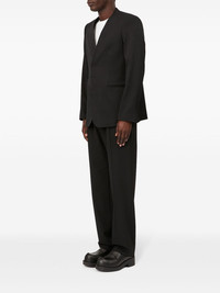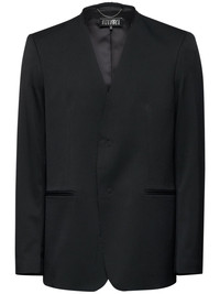 single-breasted twill blazer Highlights - Black - Twill weave - Raw-cut edge - No lapels - V-neck - Front button fastening - Shoulder pads - Long sleeves - Two front welt pockets - Straight hem Imported Composition Polyester 54%, Virgin Wool 44%, Spandex/Elastane 2%