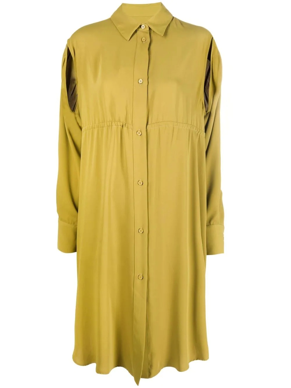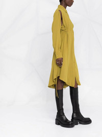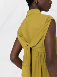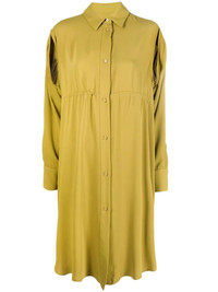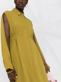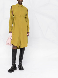 slit-sleeved shirt dress MM6 Maison Margiela elevates this olive green shirt dress with slits over the long sleeves, allowing these to be tied on the rear for an alternative, yet casual look. Made in Italy Composition Polyester 100% SIZE & FIT Model measurements Height 5 ft 10 in(1.77 m) Bust/Chest 32.28 in(82 cm) Hips 35.03 in(89 cm) Waist 25.19 in(64 cm) FittingInformation This piece fits true to size. We recommend you get your regular size Designed for a close fit at the bust and waist, but loose at the hip Made with a mid-weight non-stretch fabric Washing instructions Dry Clean Only