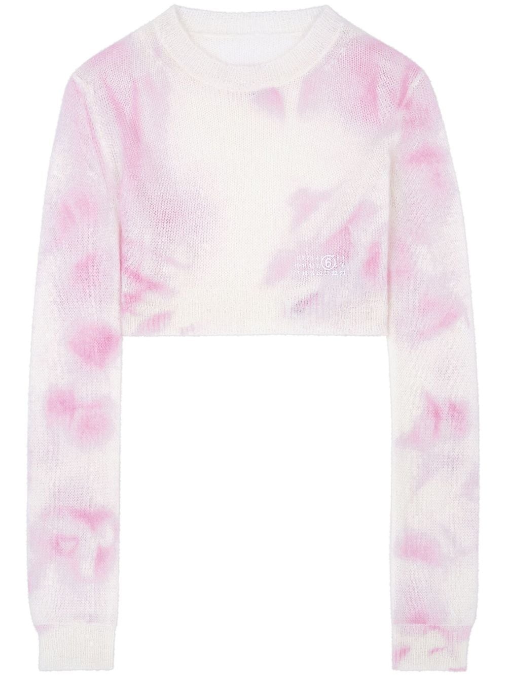 tie-dye cropped jumper Reintroducing a motif from Margiela's archives, this crop top boasts a loose soft knit construction with a sprayed colour effect in pink and white tones. Highlights - Light pink - Knitted construction - Tie-dye pattern - Signature numbers motif - Crew neck - Long sleeves - Ribbed cuffs and hem - Cropped Made in Italy Composition Acrylic 40%, Polyamide 30%, Mohair 15%, Wool 15%