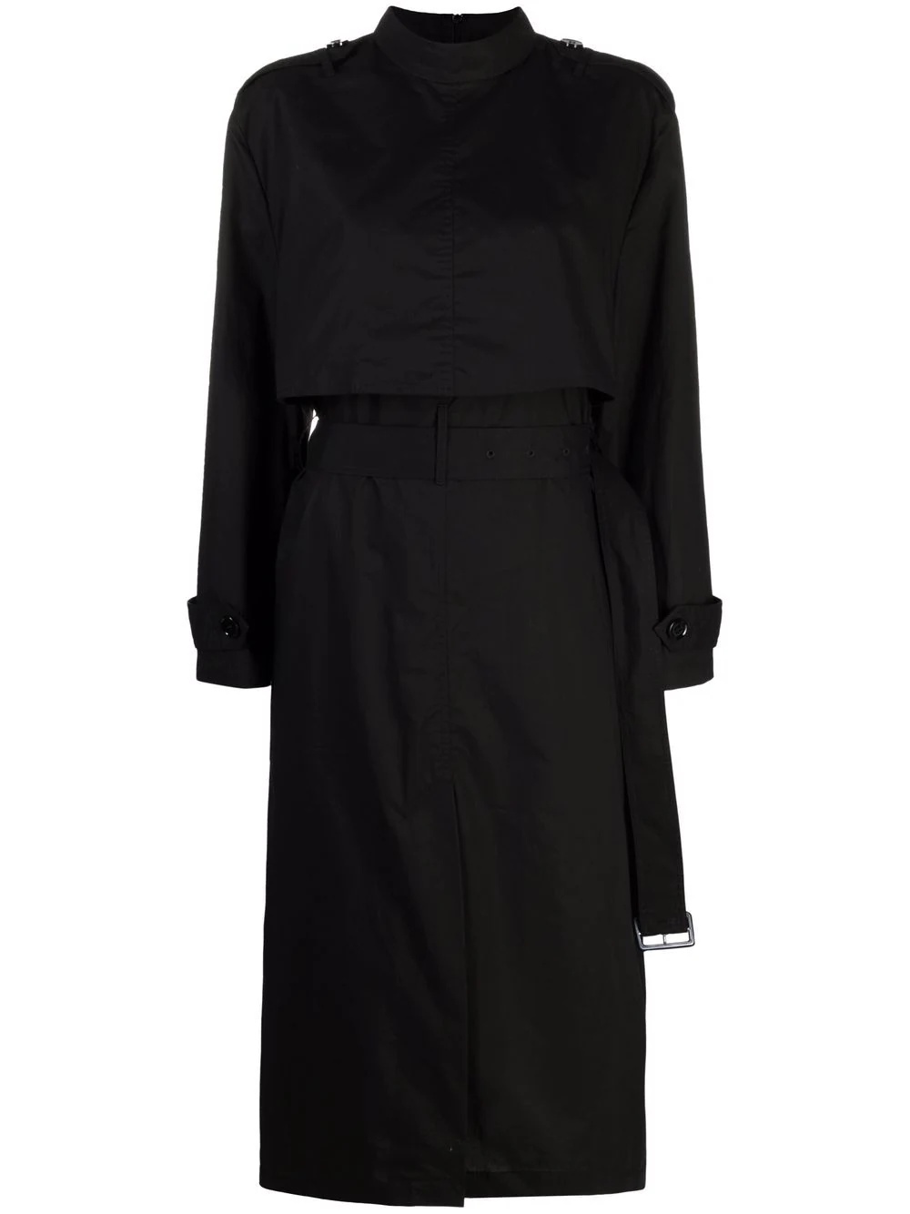 Trench cotton midi dress black cotton layered details roll neck button fastening at the shoulder long sleeves belted waist front slit straight hem Made in Italy Composition Cotton 100% SIZE & FIT Model measurements Height 5 ft 9 in(1.74 m) Bust/Chest 32.28 in(82 cm) Hips 35.82 in(91 cm) Waist 24.01 in(61 cm) FittingInformation This piece fits true to size. We recommend you get your regular size Cut for a loose fit. Comes with an adjustable belt for a flexible fit at the waist Made with a mid-weight non-stretch fabric Washing instructions Machine Wash