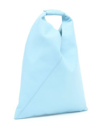 Japanese leather tote bag MM6 Maison Margiela introduces a celeste blue iteration of their Japanese origami-inspired tote bag. Crafted from pure leather, its triangle-shaped silhouette offers a luxurious yet casual feel. The top handle is decorated with a debossed logo for a subtle branded touch. Highlights - Celeste - Calf leather - Pebbled texture - Open top - Single flat top handle - Main compartment - Cotton lining Made in Italy Composition Lining: Cotton 100% Outer: Calf Leather 100% SIZE & FIT Measurement DEPTH 0.78 in(2 cm) HEIGHT 16.53 in(42 cm) WIDTH 13.38 in(34 cm) HANDLE 4.72 in(12 cm)