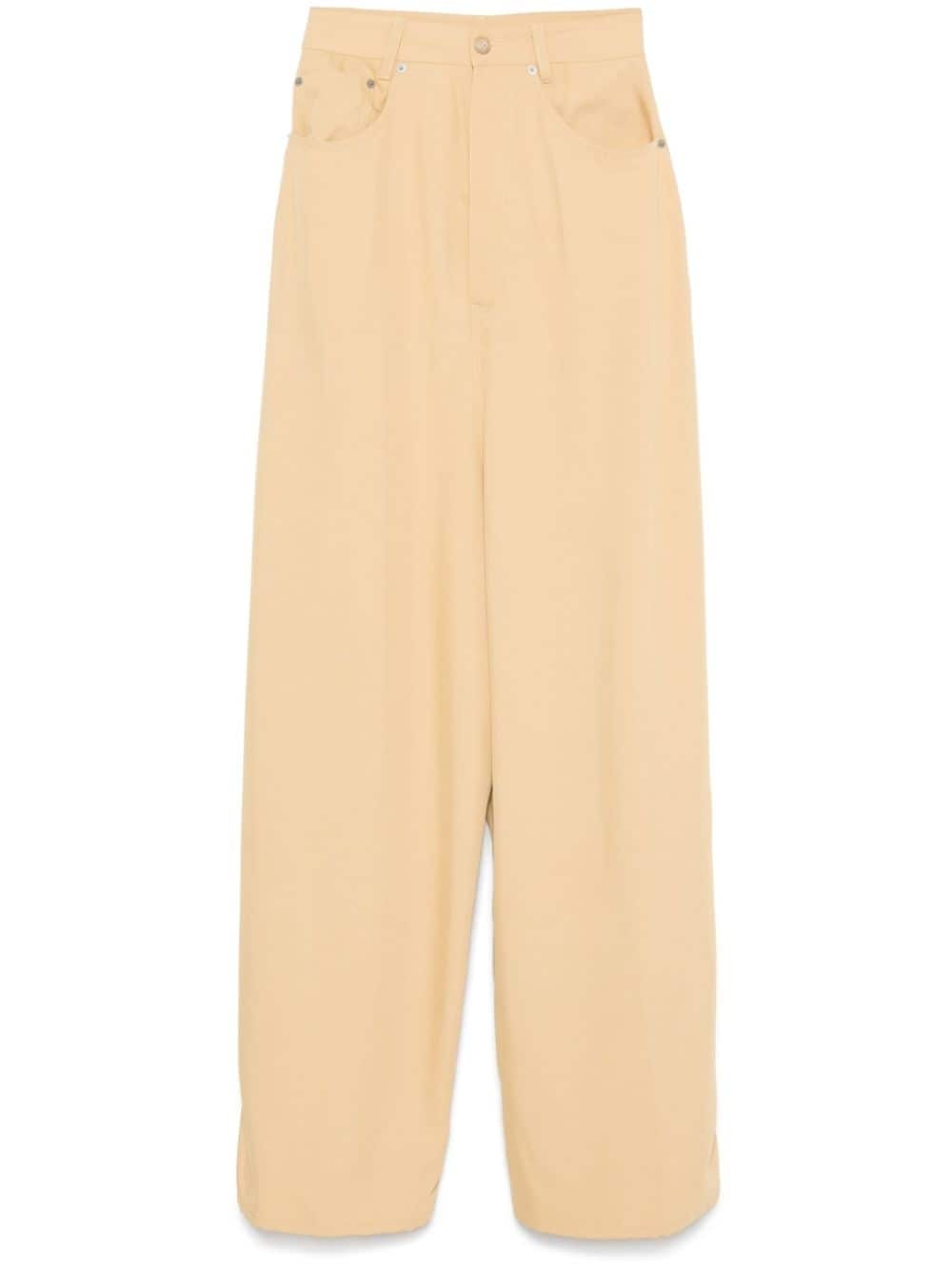 drop-crotch jeans Highlights - Camel yellow - Twill weave - Front button and zip fastening - Belt loops - Classic five pockets - Straight hem - Wide leg Made in Italy Composition Outer: Polyamide 61%, Viscose 39% Lining: Cotton 100% SIZE & FIT Model measurements Height 5 ft 11 in(1.8 m) Bust/Chest 31.49 in(80 cm) Hips 36.61 in(93 cm) Waist 24.4 in(62 cm) FittingInformation Designed with a wide leg cut, these jeans allow for a close fit at the waist and offer a loose and roomy fit over the leg Sturdy and hard-wearing, this denim piece offers no stretch