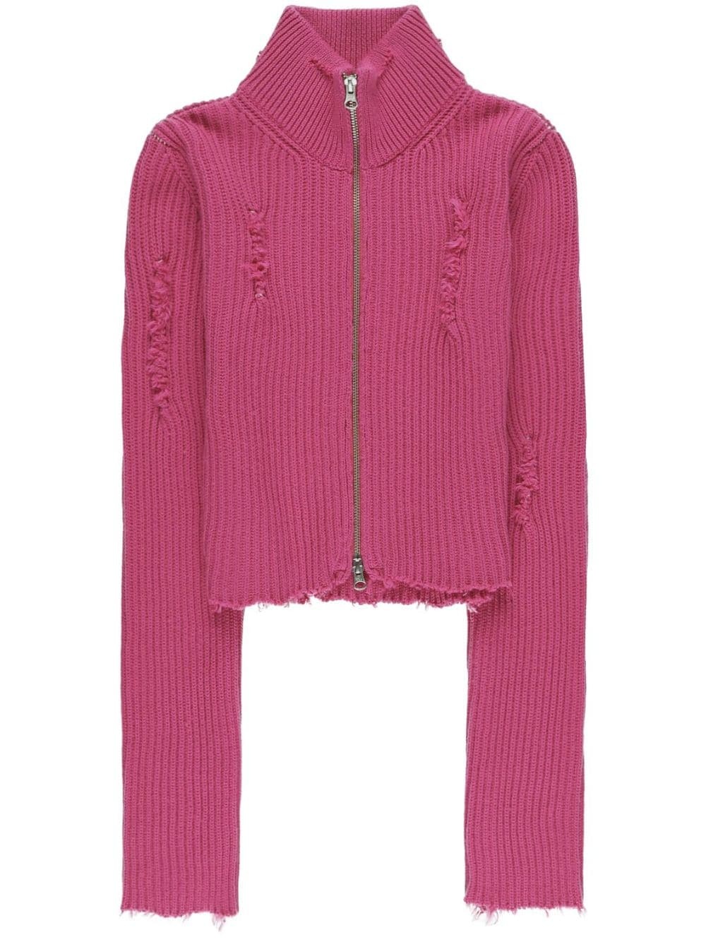 zip-up cropped cardigan Highlights - Dark pink - Cotton-wool blend - Ribbed knit - Knitted construction - Distressed finish - High neck - Front two-way zip fastening - Long sleeves - Straight hem - Cropped Made in Italy Composition Cotton 85%, Wool 15%