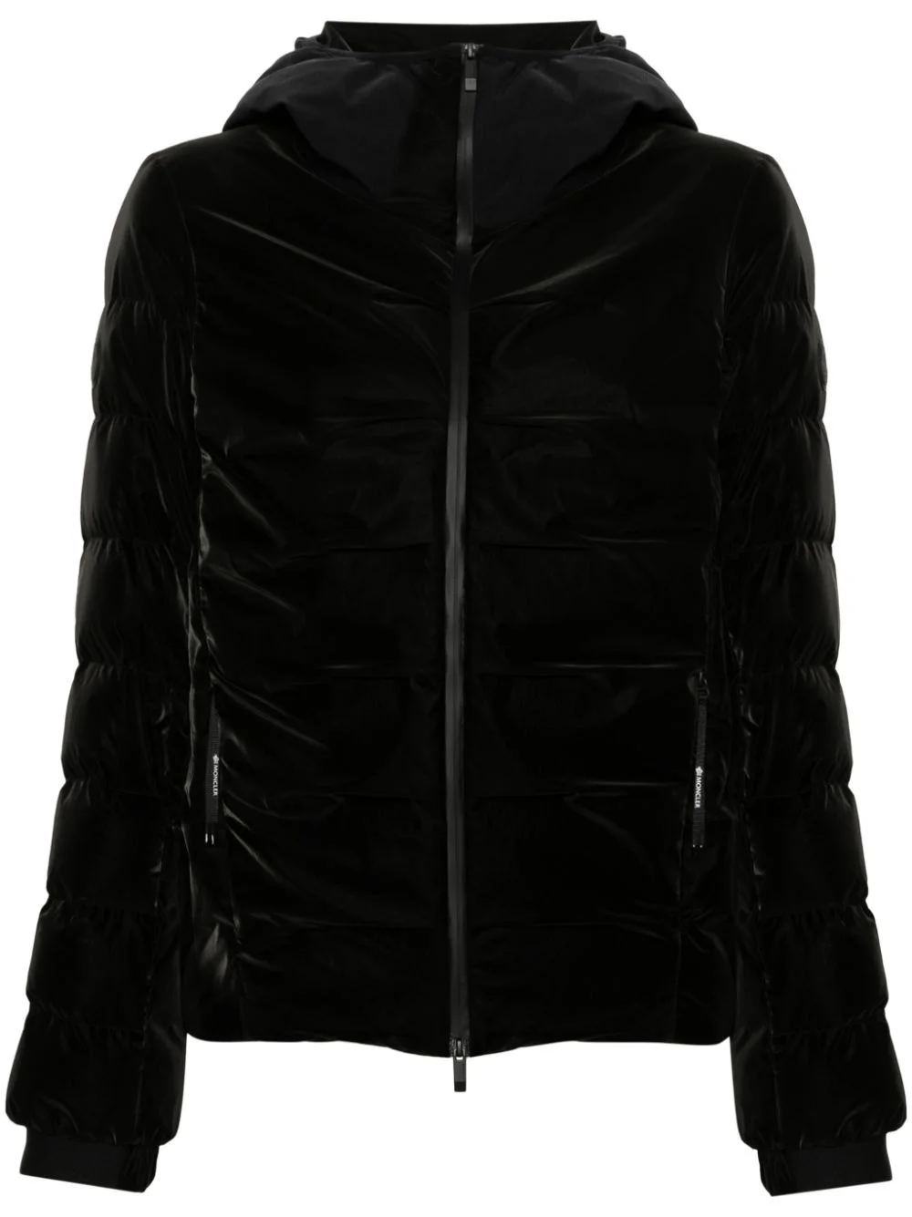 Ananke hooded puffer jacket Pinched from Moncler's Matt Black collection, this Ananke puffer jacket is engineered for practicality. It is insulated with a down-feather filling and features a hood with mesh inserts. Highlights - Black - Feather down - Padded design - Rubberised logo detail - Classic hood - Front two-way zip fastening - Long sleeves - Elasticated cuffs - Two side zip-fastening pockets - Straight hem - Drawstring hem - Full lining Made in Italy Composition Nylon 100% Washing instructions Hand Wash