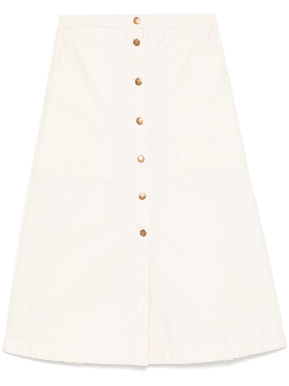 buttoned-up midi skirt Highlights - Light beige - Two side inset pockets - Logo patch to the rear - High-waisted - Seam detailing Imported Composition Cotton 59%, Polyamide 41% SIZE & FIT Model measurements Height 5 ft 11 in(1.8 m) Bust/Chest 31.49 in(80 cm) Hips 36.61 in(93 cm) Waist 24.4 in(62 cm) FittingInformation This midi-length skirt is intended to be worn high on the waist Made from a midweight non-stretch fabric