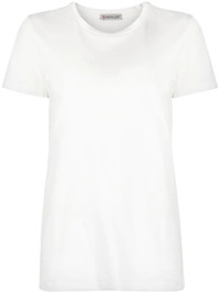 crew-neck T-shirt Moncler offers a minimalist design with this T-shirt. Crafted from cotton to a crew-neck silhouette, it boasts a white hue for a classic finish. Highlights - White - Cotton - Round neck - Short sleeves - Logo patch at the sleeve - Straight hem Imported Composition Cotton 100% SIZE & FIT Model measurements Height 5 ft 10 in(1.77 m) Bust/Chest 31.49 in(80 cm) Hips 33.85 in(86 cm) Waist 22.44 in(57 cm) FittingInformation Designed for a slim fit that sits just away from the body offering a close yet comfortable fit Made from a midweight non-stretch fabric, this piece offers minimal elasticity when worn This piece fits true to size – take your usual size Washing instructions Machine Wash