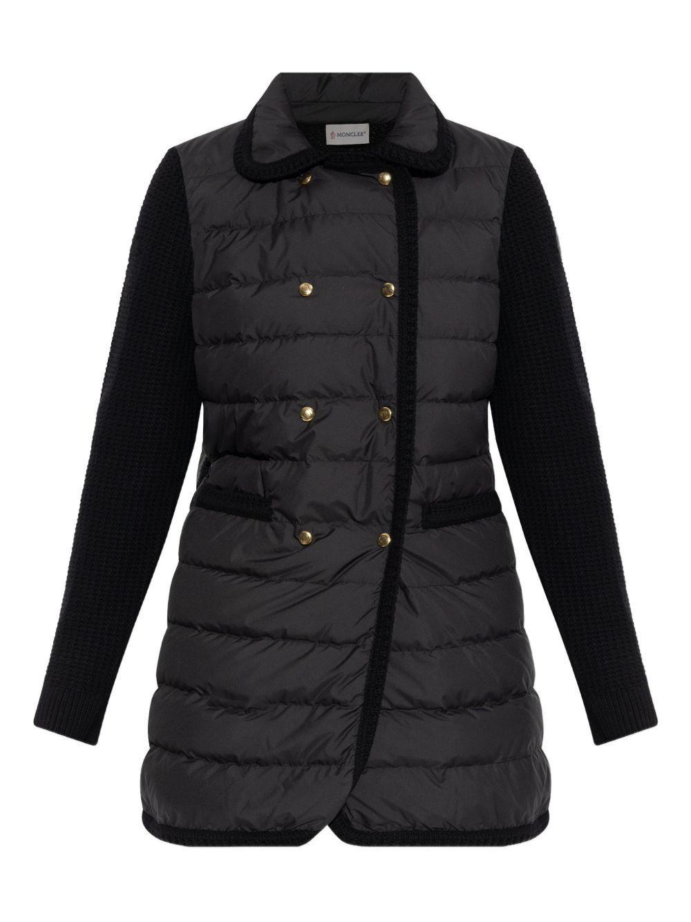 double-breasted panelled coat Highlights - Black - Panelled design - Double-breasted - Button fastening - Knitted sleeves - Knitted back - Collared Imported Composition Outer: Polyester 100%, Calf Leather 100%, Virgin Wool 90%, Cashmere 10% Lining: Polyester 100%, Down 90%, Feather 10% Washing instructions Read Manufacturer Guidelines