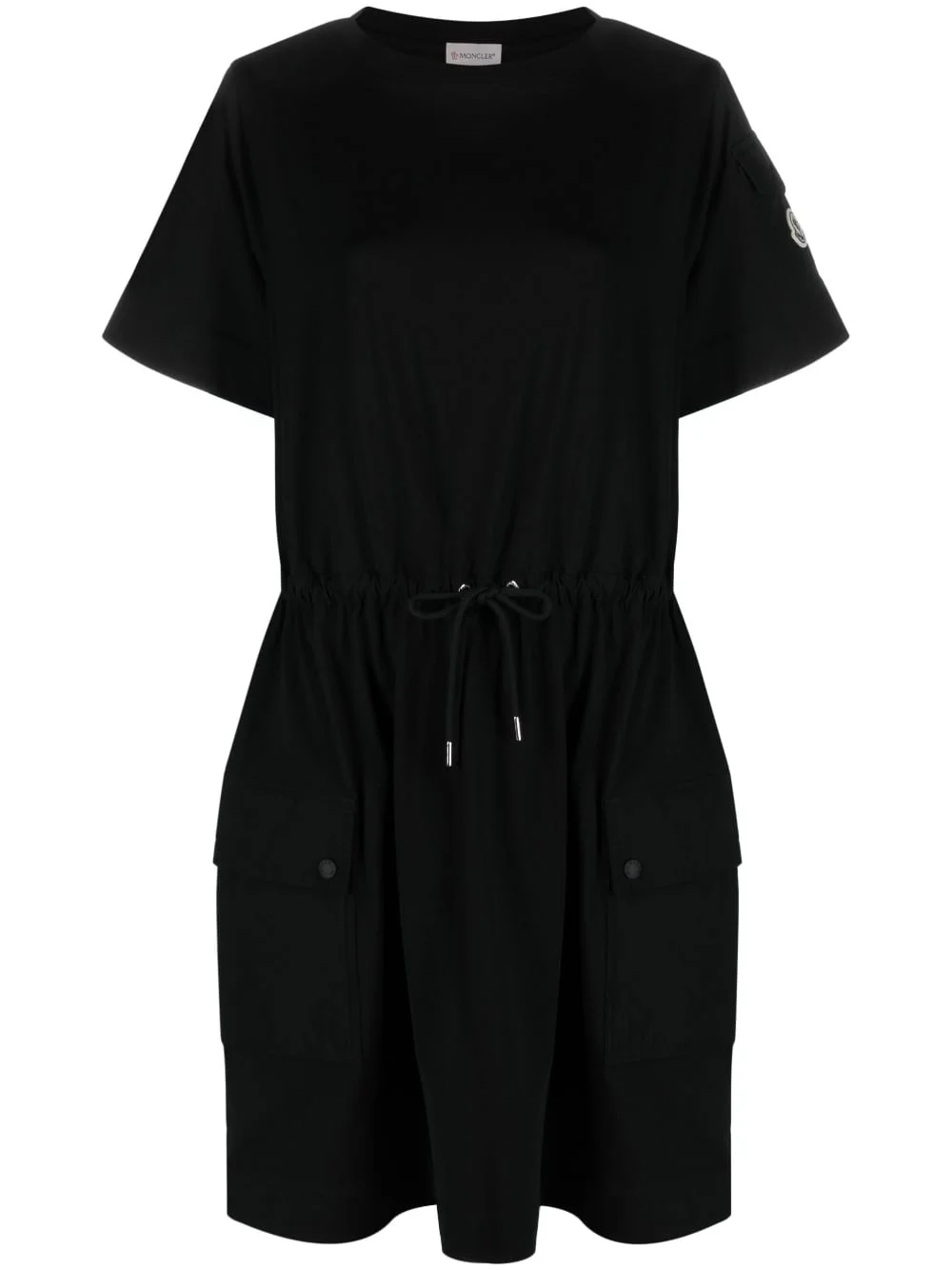 drawstring-waist T-shirt dress Moncler displays its functional aesthetic in the design of this T-shirt dress. Spun from black cotton jersey, it benefits from a drawstring-fastening waist and three flap pockets, one of which is decorated with the brand’s signature logo patch. Highlights - Black - Cotton - Logo patch at the sleeve - Boat neck - Short sleeves - Sleeve patch pocket - Drawstring fastening waist - Two side flap pockets - Above-knee length - Straight hem Imported Composition Cotton 100% Washing instructions Hand Wash