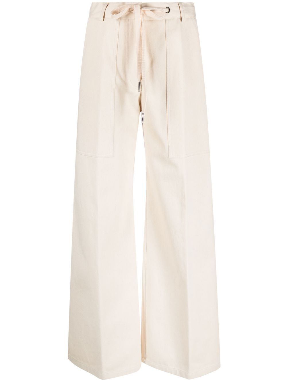 drawstring wide-leg trousers Seamlessly combining performance and craftsmanship, these light beige trousers by Moncler are cut for a versatile wide leg and sit high at the waist where they fasten with a drawstring. Imported Composition Cotton 100% SIZE & FIT Model measurements Height 5 ft 10 in(1.78 m) Bust/Chest 29.92 in(76 cm) Hips 34.64 in(88 cm) Waist 23.62 in(60 cm) FittingInformation This piece fits true to size. We recommend you get your regular size Designed to be fitted at the waist and hips, loose over the leg Made with a mid-weight non-stretch fabric Washing instructions Machine Wash