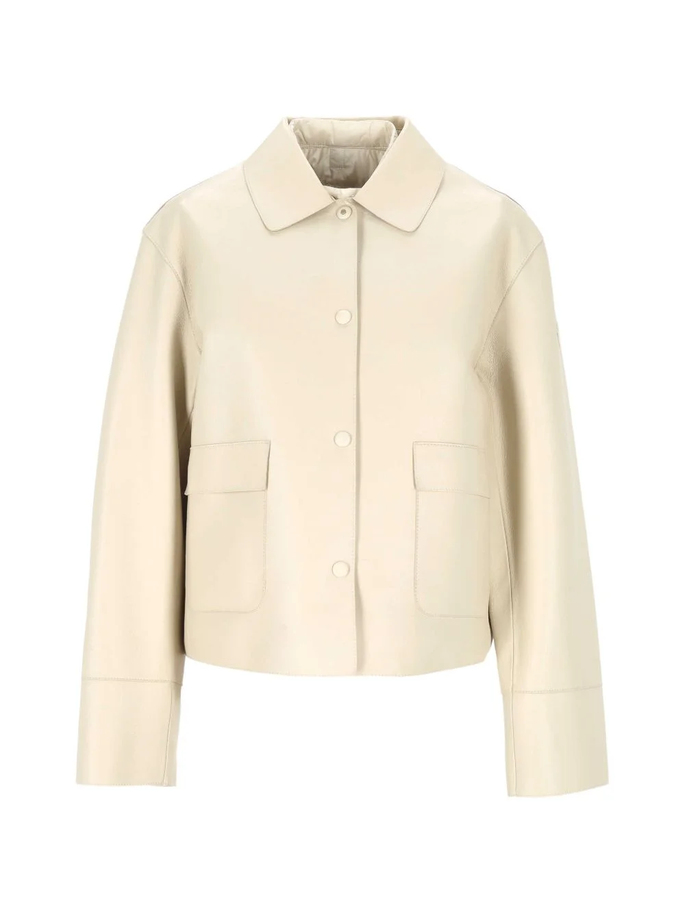 flap-pocket leather jacket Highlights - Beige - Leather - Point collar - Button fastening - Long sleeves - Front patch pockets Imported Composition Filling: Down 90%, Feather 10% Outer: Lamb Skin 100%, Polyamide 100% Lining: Polyamide 100%