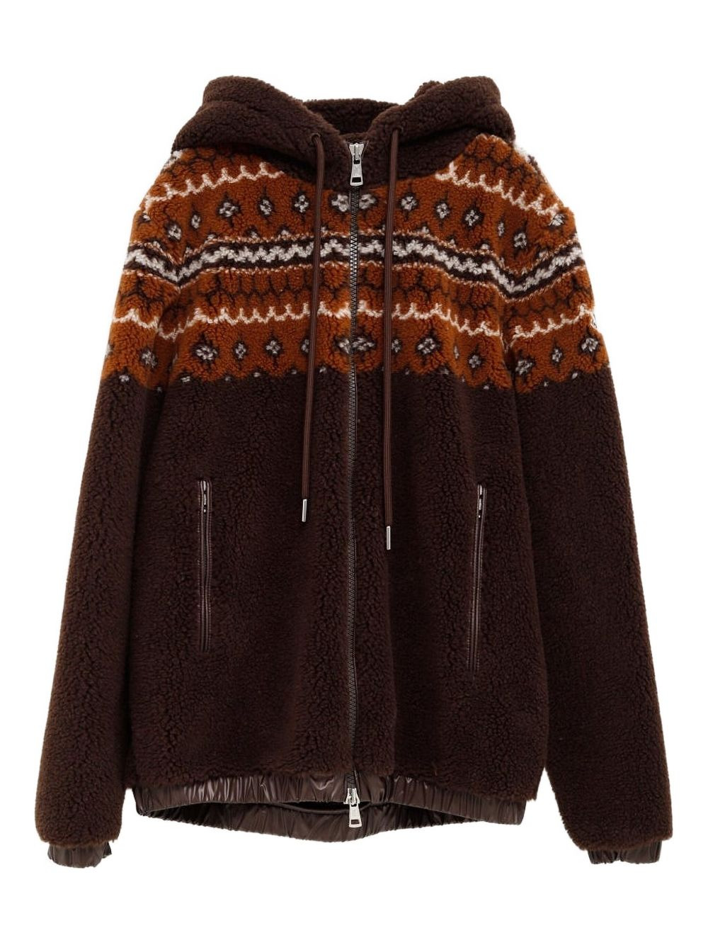 geometric-pattern hooded jacket Highlights - Brown - Geometric pattern - Zip fastening - Drawstring hood - Zip pockets - Elasticated hem Imported Composition Outer: Polyester 69%, Virgin Wool 31% Lining: Polyester 100% Washing instructions Dry Clean Only