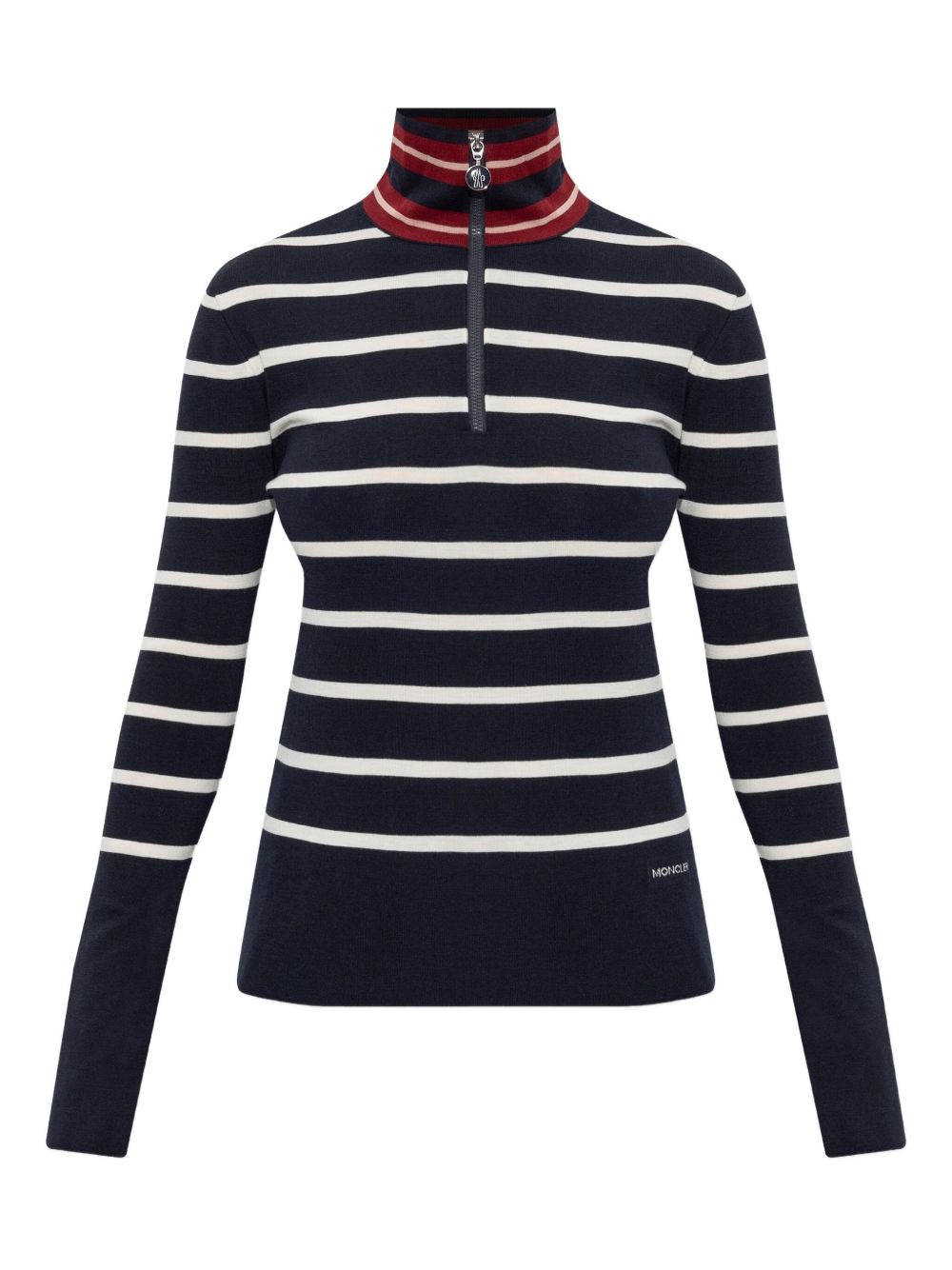 high-neck striped jumper Highlights - Navy blue - Horizontal stripes - Half zip fastening - Ribbed cuffs - High neck - Logo detail - Wool Imported Composition Virgin Wool 100% Washing instructions Read Manufacturer Guidelines