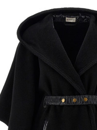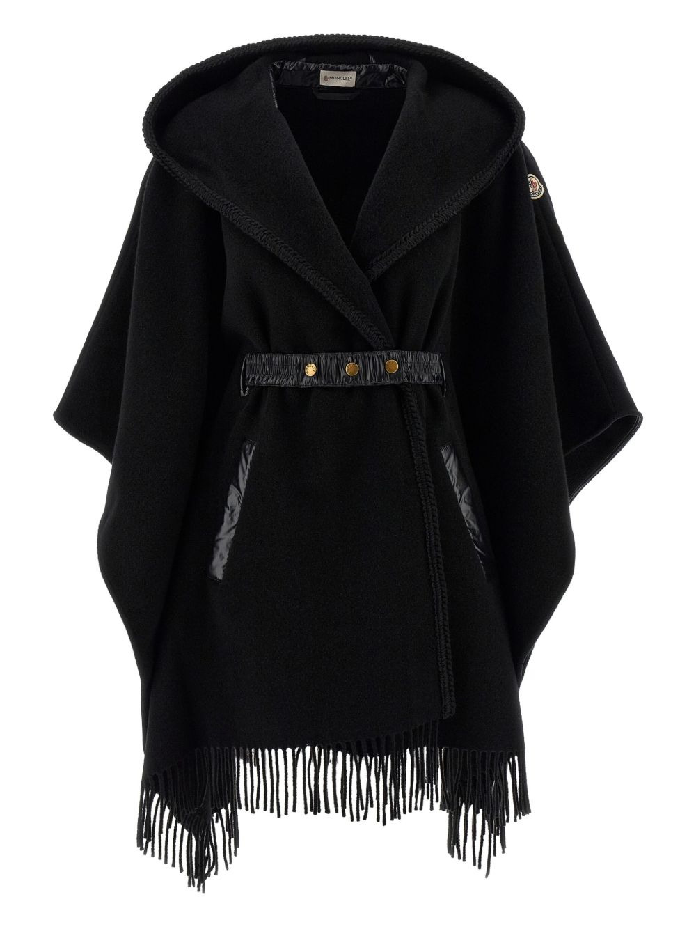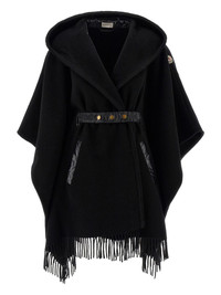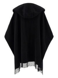 hooded fringed cape Highlights - Black - Tonal trimming - Hood - Asymmetric hem - Logo patch on the sleeve - Fringed trim Imported Composition Virgin Wool 100%, Polyamide 100% Washing instructions Dry Clean Only