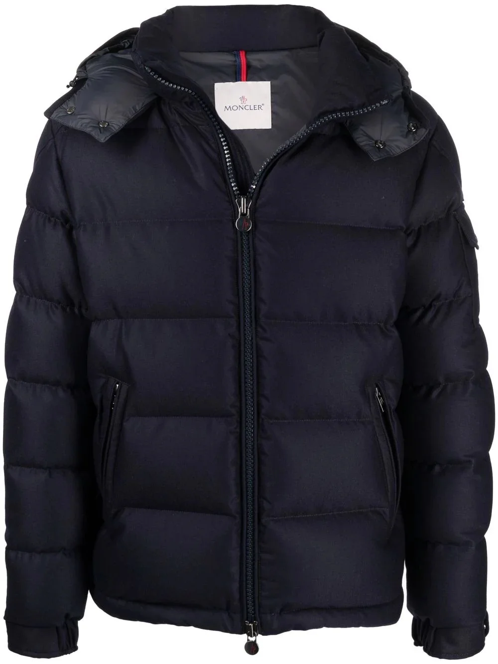 hooded puffer jacket Comfort remains at the forefront of Moncler’s designs, with technical fabrics and functional designs defining the brand’s collections. With a heavily padded interior and a protective high neck, the Montgenevre jacket is evidence of the brand’s aesthetic. Highlights - Navy blue - Virgin wool - Flannel - Down-feather filling - Padded design - Stand-up collar - Detachable hood - Long sleeves - Press-stud fastening cuffs - Sleeve flap pocket - Logo patch at the sleeve - Front zip fastening pockets - Drawstring hem - Full lining - Front two-way zip fastening Made in Italy Composition Outer: Virgin Wool 100% Lining: Polyamide 100%, Down 90%, Feather 10% SIZE & FIT Model measurements Height 6 ft 1 in(1.85 m) Bust/Chest 37.79 in(96 cm) Hips 37.4 in(95 cm) Waist 30.7 in(78 cm) Measurement CHEST 52.36 in(133 cm) SLEEVE LENGTH 26.77 in(68 cm) LENGTH 28.34 in(72 cm) WAIST 50.39 in(128 cm) FittingInformation This piece fits true to size. We recommend you get your regular size Cut for a loose fit Made with a mid-weight non-stretch fabric Washing instructions Dry Clean Only