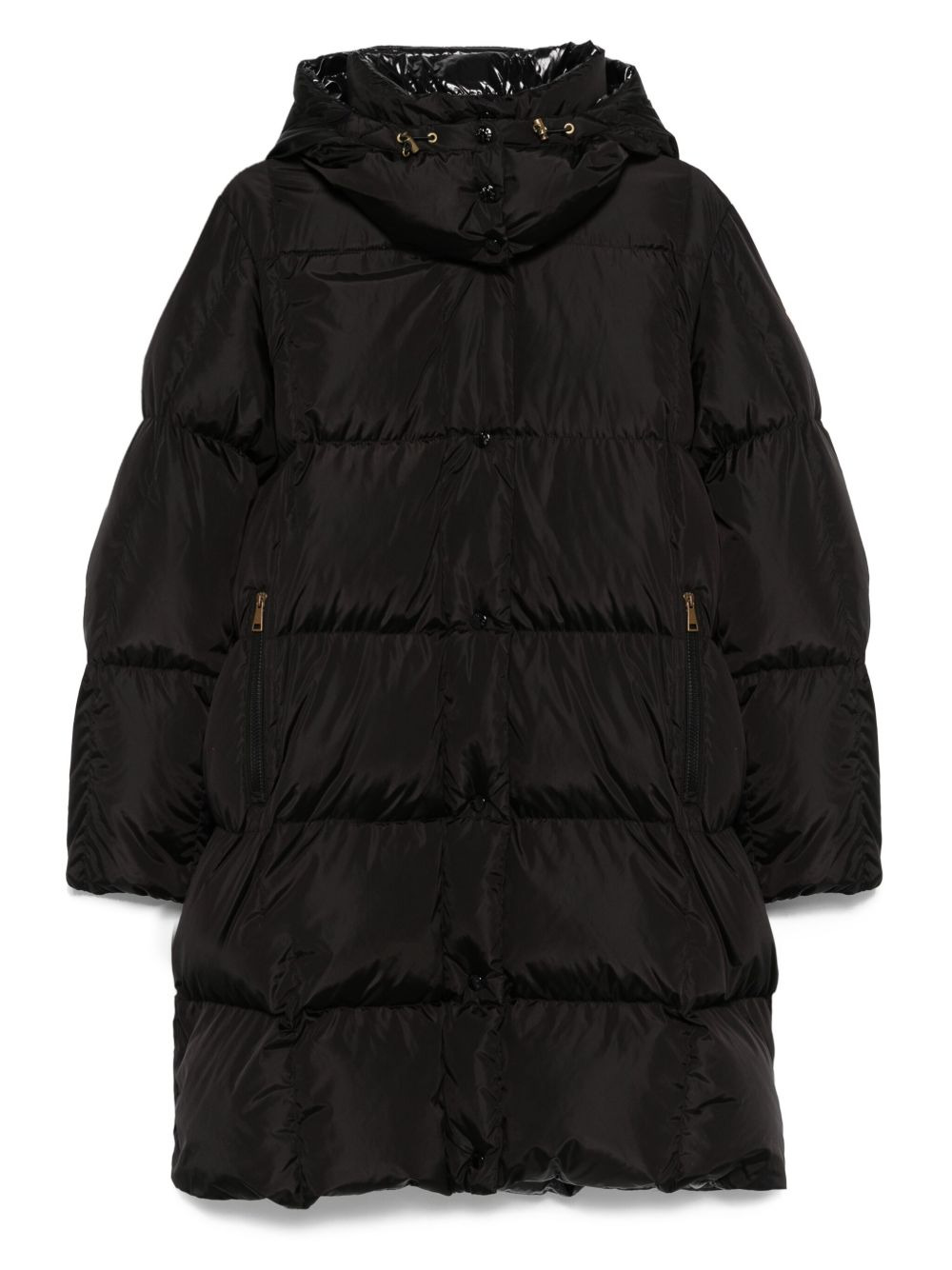 hooded quilted coat Highlights - Black - Quilted design - Hooded neckline - Button fastening - Long sleeves Imported Composition Outer: Polyamide 100% Lining: Polyamide 100%, Goose Down 90%, Goose Feather 10% Washing instructions Machine Wash