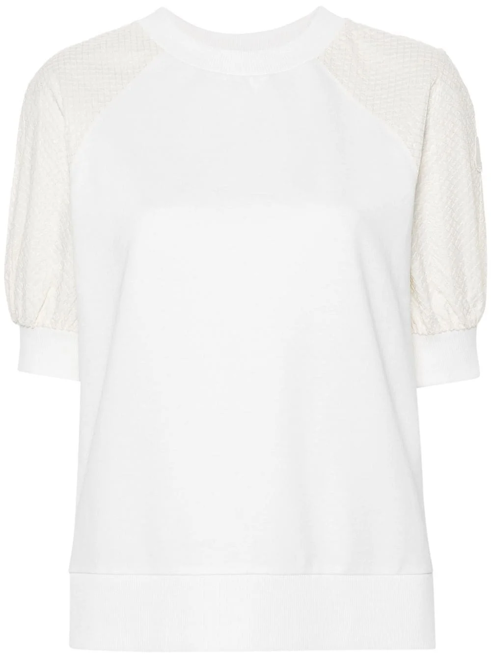 lace-up detail T-shirt Highlights - White - Cotton blend - Crew neck - Short puff sleeves with textured finish - Applique logo at the sleeve - Ribbed cuffs and hem - Straight hem - Rear lace-up fastening Imported Composition Polyamide 100%, Cotton 77%, Polyester 23% Washing instructions Dry Clean Only