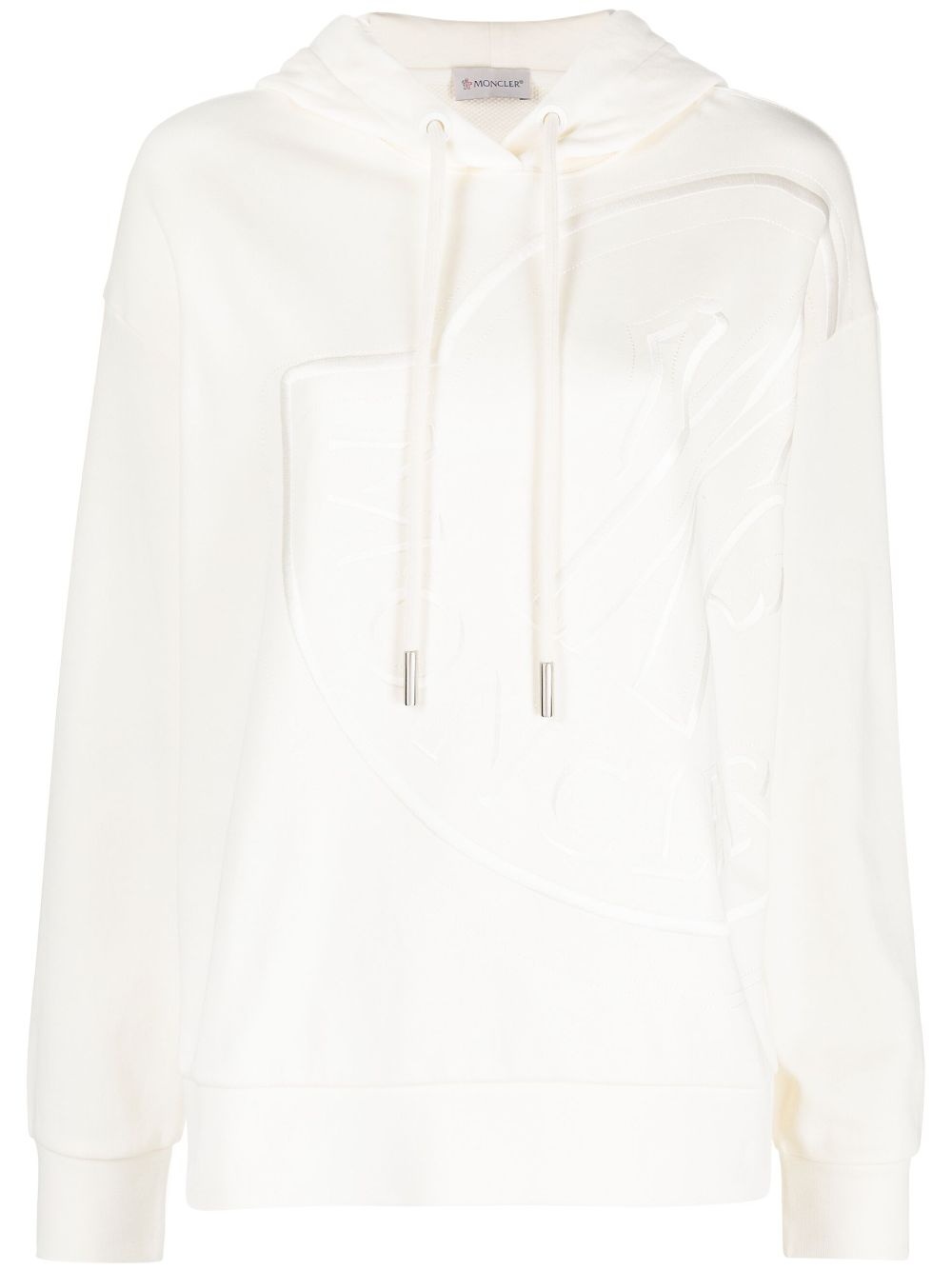 logo-embroidered cotton hoodie Moncler’s iconic logo combine’s the first letter of the brand’s name with an outlined rooster – the unofficial national symbol of France and a nod to the brand’s roots. An oversized iteration of the emblem is embroidered in asymmetric form at the side of this cotton-jersey hoodie. Highlights - White - Cotton - Jersey knit - Embroidered logo to the front - Drawstring hood - Drop shoulder - Long sleeves - Ribbed trim - Straight hem Imported Composition Outer: Cotton 91%, Polyamide 9% Lining: Cotton 100% SIZE & FIT Model measurements Height 5 ft 10 in(1.79 m) Bust/Chest 31.1 in(79 cm) Hips 35.03 in(89 cm) Waist 24.01 in(61 cm) FittingInformation Designed for a relaxed fit, this piece allows for comfort and movement when worn Made from a midweight non-stretch fabric, this piece offers minimal elasticity when worn This piece fits true to size – take your usual size Washing instructions Machine Wash
