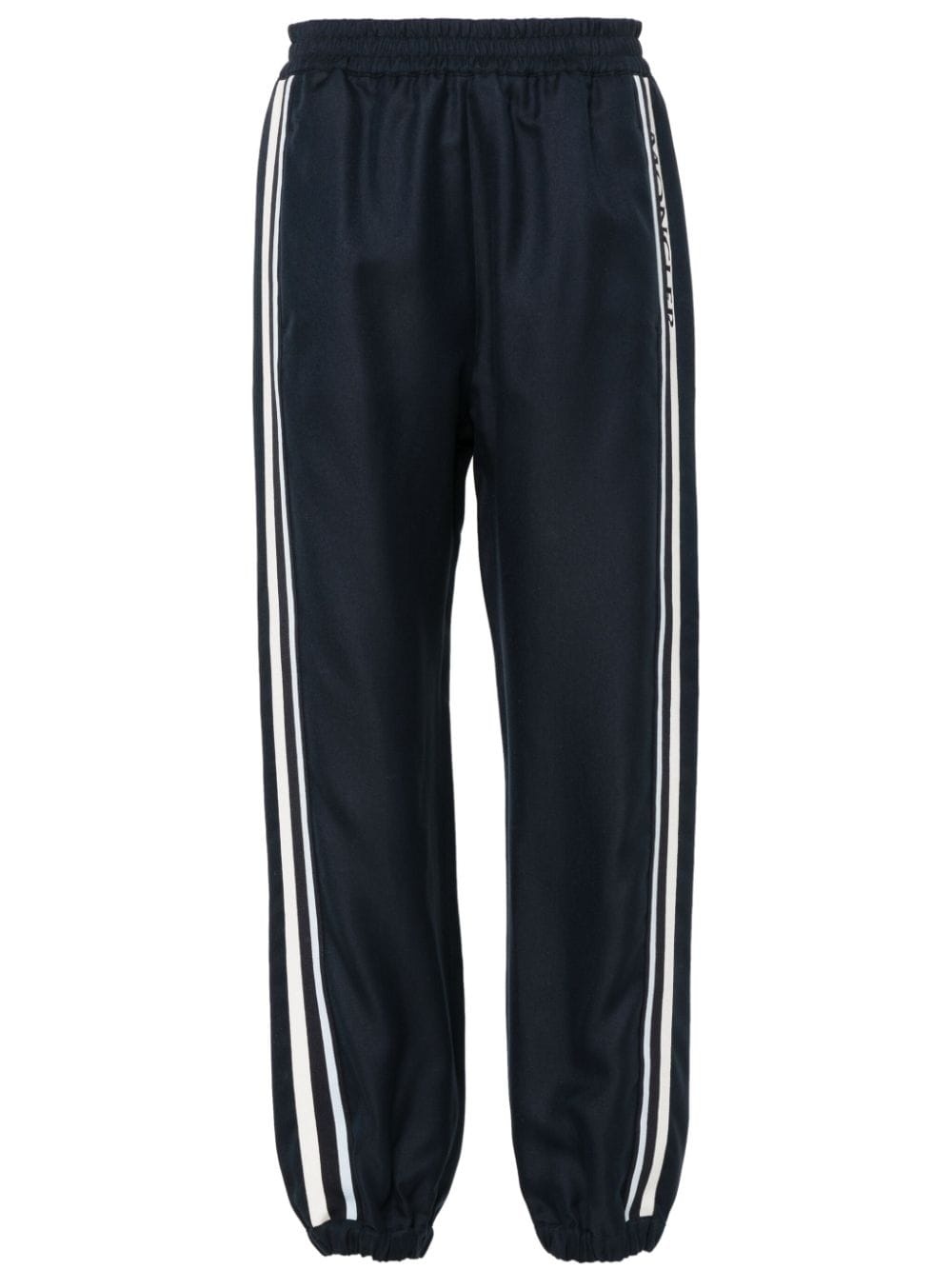 logo-embroidered track pants Highlights - Navy blue/multicolour - Twill weave - Two side inset pockets - Side stripe detailing - Embroidered logo to the side - Internal logo tag - Tapered leg - Elasticated ankles - Elasticated waistband Imported Composition Viscose 100%, Polyester 100% SIZE & FIT Model measurements Height 5 ft 11 in(1.8 m) Bust/Chest 33.07 in(84 cm) Hips 37 in(94 cm) Waist 25.59 in(65 cm) Measurement FRONT RISE 12 in(30.5 cm) INSIDE LEG 27 in(68.6 cm) BACK RISE 14.01 in(35.6 cm) HIPS 37.99 in(96.5 cm) Hem Width 10 in(25.4 cm) WAIST 27.99 in(71.1 cm) FittingInformation Designed for a relaxed tapered cut, these trousers allow for a close fit at the waist and offer a loose fit at the thighs, with a closer fit toward the ankles The elasticated waist and hem offer a secure, comfortable fit Made from a midweight non-stretch fabric This piece fits true to size – take your usual size Washing instructions Dry Clean Only