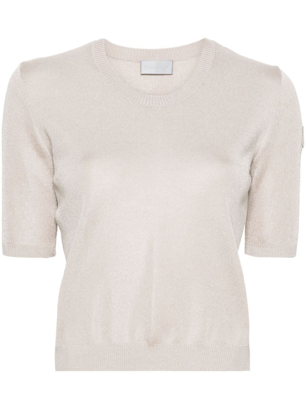 logo-patch short-sleeve jumper Highlights - Light beige - Knitted construction - Metallic sheen - Logo patch at the sleeve - Crew neck - Short sleeves - Ribbed cuffs and hem - Authenticity qr code Imported Composition Polyester 64%, Cotton 36% SIZE & FIT Model measurements Height 5 ft 11 in(1.8 m) Bust/Chest 34.25 in(87 cm) Hips 35.82 in(91 cm) Waist 24.8 in(63 cm) FittingInformation Designed for a relaxed fit, this piece allows for comfort and movement when worn The ribbed hem offers a close, comfortable fit Made with a midweight knit, this piece offers some stretch This piece fits true to size – take your usual size Washing instructions Dry Clean Only
