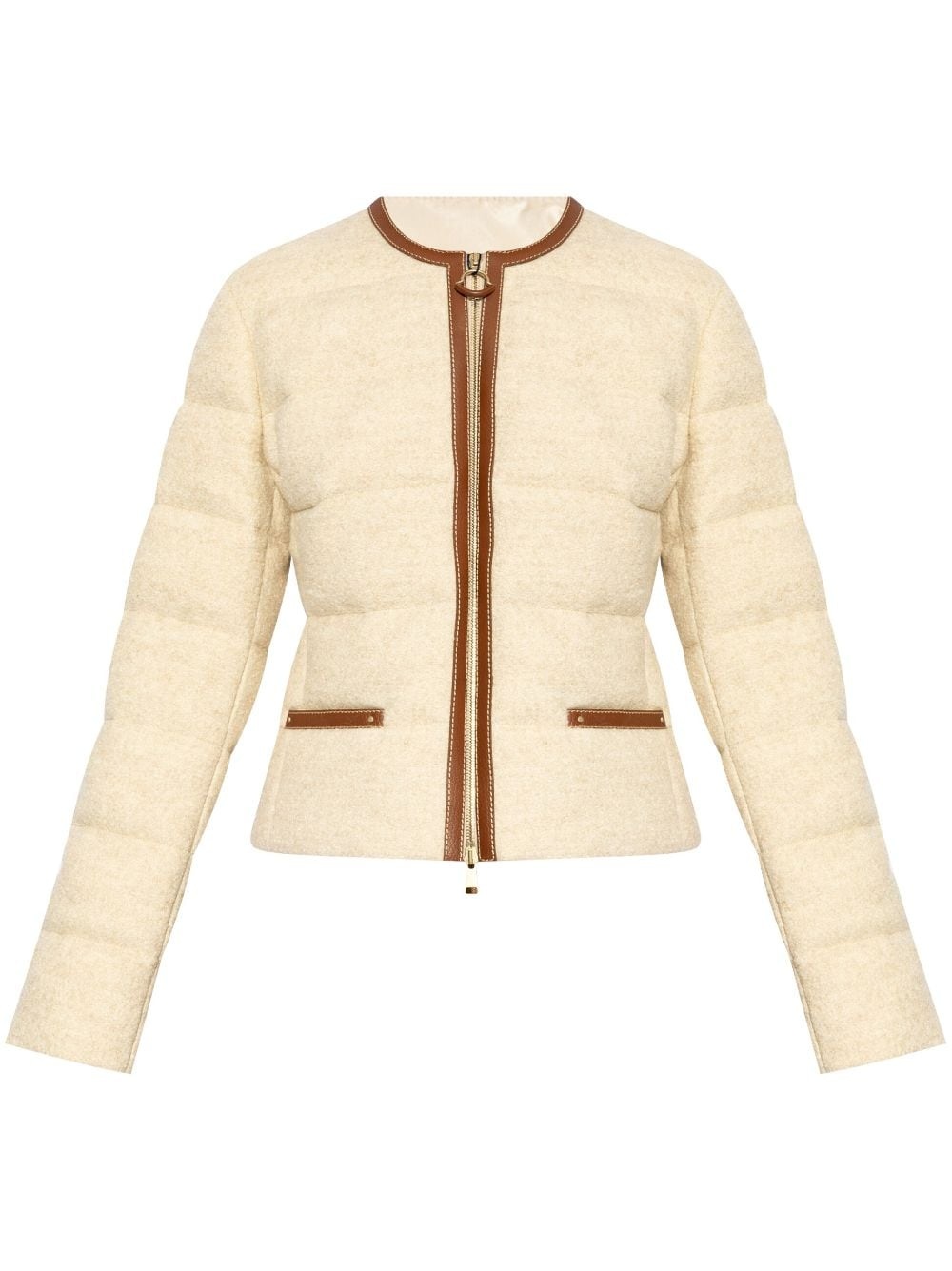 panelled padded jacket Highlights - Beige - Wool blend - Down-feather filling - Quilted - Padded panels - Crew neck - Contrasting border - Long sleeves - Logo patch at the sleeve - Two side welt pockets - Straight hem - Front two-way zip fastening Imported Composition Outer: Calf Leather 100%, Wool 62%, Viscose 28%, Polyamide 10% Lining: Polyamide 100%, Down 90%, Feather 10%