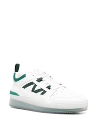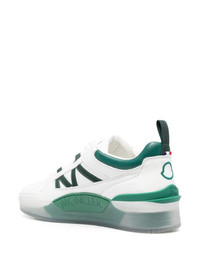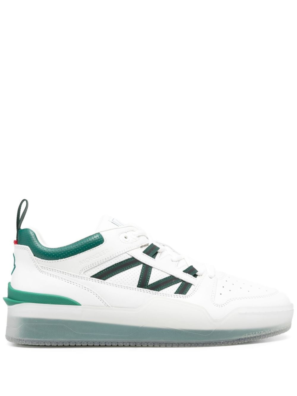 Pivot leather sneakers Moncler presents the Pivot – a low-top sneaker inspired by basketball styles. Crafted in Italy from white calf leather, the pair is embellished with green ripstop straps on the sides that resemble the brand's initial. Underneath, an EVA midsole offers lightweight cushioning, while the translucent rubber sole lends a modern feel. Highlights - White/bright green - Calf leather - Ripstop straps - Round toe - Front lace-up fastening - Logo patch at the tongue - Branded insole - Branded heel counter - Logo pull-tab at the heel - Eva midsole - Chunky translucent rubber sole Made in Italy Composition Outer: Calf Leather 100% Sole: Rubber 100% Lining: Calf Leather 100% SIZE & FIT Measurement HEEL 1.57 in(4 cm) Sole height 0.78 in(2 cm)