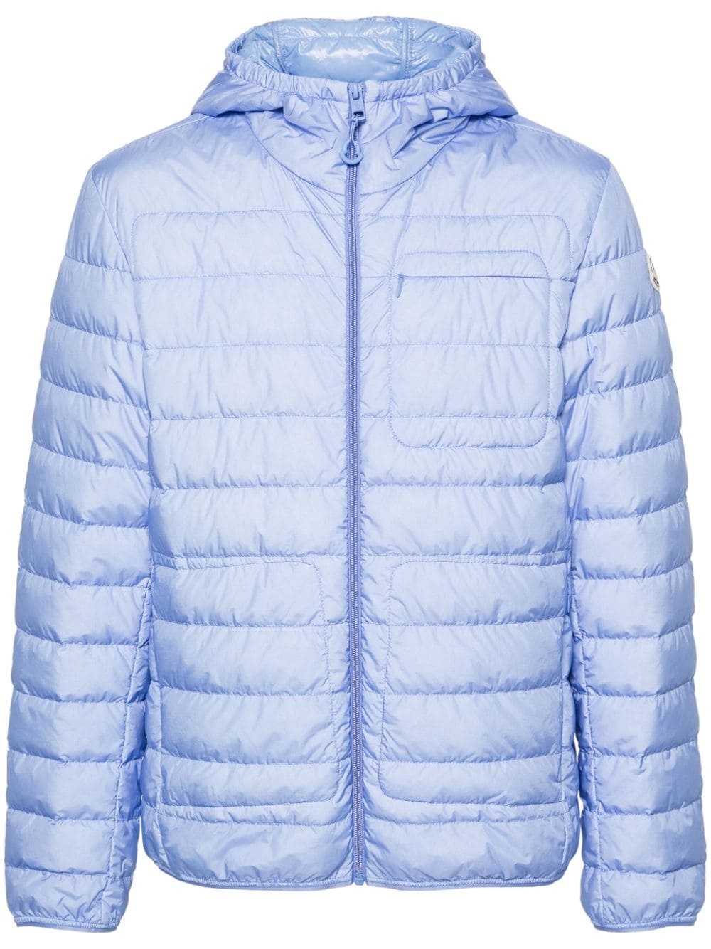 Pulao padded jacket Padded with a plush feather down for added warmth and insulation, Moncler's Pulao jacket features a horizontal quilting that enhances its voluminous silhouette. A funnel neck and hood offer added protection from the elements. Highlights - Cornflower blue - Shell - Down-feather filling - Padded design - Quilted - Logo patch at the sleeve - Elasticated hood - Long sleeves - Elasticated cuffs - Two side zip-fastening pockets - Straight hem - Front zip fastening Imported Composition Outer: Polyamide 100% Lining: Polyamide 100%, Feather Down 100% SIZE & FIT Model measurements Height 6 ft 2 in(1.87 m) Bust/Chest 37.79 in(96 cm) Hips 37.79 in(96 cm) Waist 30.31 in(77 cm) FittingInformation Designed for a regular fit, allowing for a comfortably loose fit throughout the body Made from a padded non-stretch fabric, giving it no natural elasticity This piece fits true to size – take your usual size Washing instructions Hand Wash