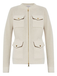 ribbed pocketed cardigan Highlights - Off-white - Ribbed knit - Zip front fastening - Flap pockets - Gold-tone hardware Imported Composition Polyester 100%, Wool 100% Washing instructions Read Manufacturer Guidelines