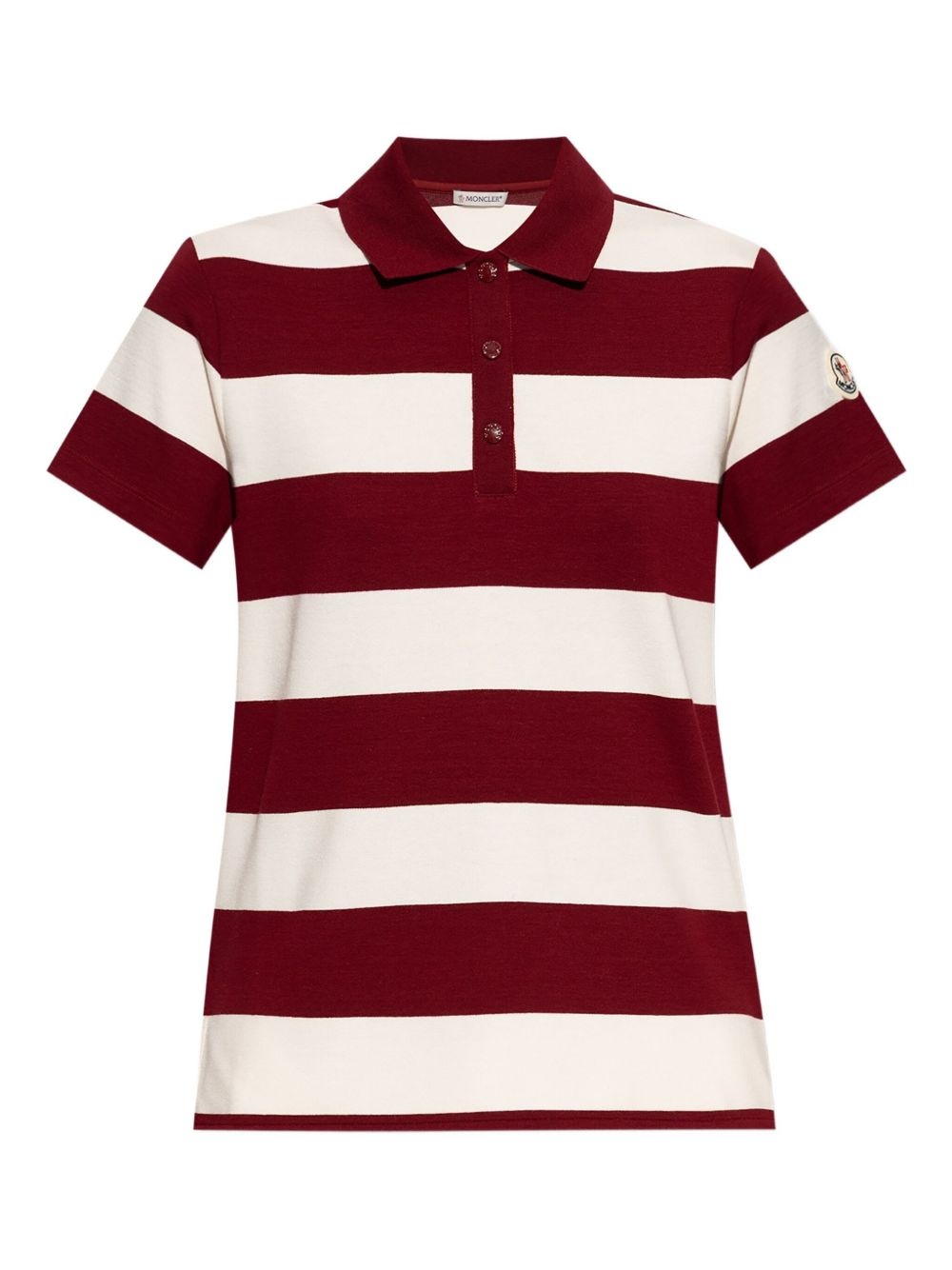 striped polo shirt Highlights - Burgundy and cream - Contrasting stripes - Three-button placket - Logo patch on sleeve - Short sleeves Made in Italy Composition Viscose 90%, Polyamide 8%, Elastane 2%