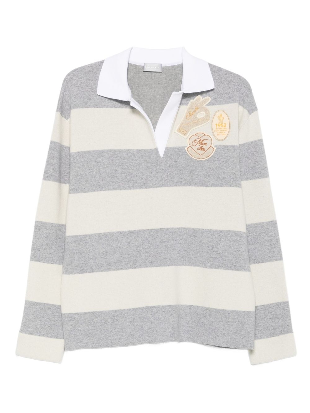 striped sweatshirt Highlights - Light grey - V-neck - Polo collar Made in Italy Composition Virgin Wool 62%, Cotton 35%, Polyamide 2%, Elastane 1% SIZE & FIT Model measurements Height 5 ft 10 in(1.79 m) Bust/Chest 31.88 in(81 cm) Hips 35.43 in(90 cm) Waist 23.62 in(60 cm) Washing instructions Dry Clean Only