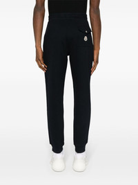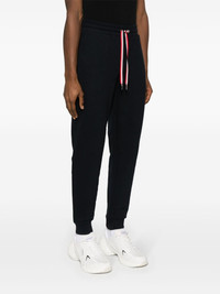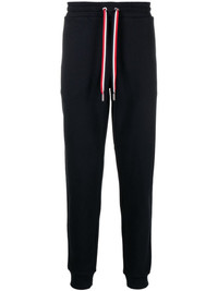 Tricolour Accent cotton track pants Moncler's laid-back style is showcased with these track pants. They are crafted from cotton fleece and embellished with a tricolour drawstring on the waist. Highlights - Navy blue - Cotton - Jersey texture - Logo patch to the rear - Elasticated drawstring waistband - Signature tricolour detail - Two side slit pockets - Rear flap pocket - Elasticated ankles - French terry lining Made in United Kingdom Composition Cotton 100% SIZE & FIT Model measurements Height 6 ft 2 in(1.88 m) Bust/Chest 36.61 in(93 cm) Hips 35.82 in(91 cm) Waist 27.95 in(71 cm) FittingInformation Designed for a relaxed tapered leg, allowing a comfortable loose fit above the knee with a closer fit towards the calves Adjust this piece’s waistband to your preference using the drawstring Made from a midweight non-stretch fabric, this piece offers minimal elasticity when worn This piece fits true to size – take your usual size Washing instructions Machine Wash