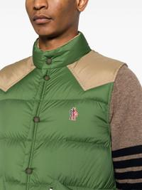 Veny down gilet Moncler Grenoble's green Veny gilet is inspired by retro outdoor styles. It’s crafted from water-repellent lounge saison that’s quilted for even insulation and panelled with beige canvas at the yoke. Highlights - Green/light beige - Shell - Canvas panels - Feather down - Padded design - Quilted - Water-repellent - Front press-stud fastening - High neck - Elasticated arm holes - Applique logo - Two press-stud fastening side pockets Imported Composition Outer: Polyamide 100% Lining: Polyamide 100%, Feather Down 100% SIZE & FIT Model measurements Height 6 ft 2 in(1.87 m) Bust/Chest 36.22 in(92 cm) Hips 37 in(94 cm) Waist 27.95 in(71 cm) FittingInformation Designed for a slim fit, offering a comfortable fit that sits just away from the body Made from a padded non-stretch fabric, giving it no natural elasticity This piece fits true to size – take your usual size
