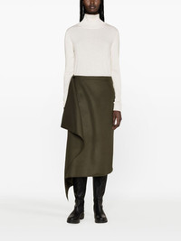 wool-cashmere midi wrap skirt This dark-green Moncler midi skirt is crafted from felted wool-cashmere to a deconstructed wrap silhouette – the fluidly draped panel cascades from one hip to create an asymmetric hem. Highlights - Dark green - Virgin wool-cashmere blend - Felted finish - Wrap design - Applique logo - Draped panel detail - Mid-rise - Side button fastening - Asymmetric hem Imported Composition Virgin Wool 90%, Cashmere 10% SIZE & FIT Model measurements Height 5 ft 11 in(1.8 m) Bust/Chest 34.25 in(87 cm) Hips 35.82 in(91 cm) Waist 24.8 in(63 cm) FittingInformation This midi-length skirt is intended to be worn high on the waist Made from a midweight non-stretch fabric This piece fits true to size – take your usual size Washing instructions Dry Clean Only