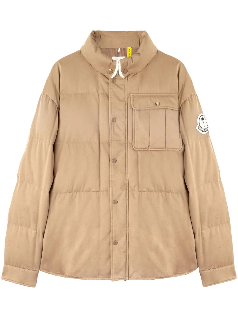 x Moncler logo-applique puffer jacket Palm Angels and Moncler team up once again to present the Fieldrush puffer jacket. Crafted in Italy, it arrives in an understated beige hue and is defined by its quilted construction. In signature Moncler fashion, a logo patch adorns the left sleeve – this time nodding towards the collaborative nature of the piece. Highlights - Beige - Cotton - Padded design - High neck - Front press-stud and zip fastening - Long sleeves - Logo patch at the sleeve - Chest flap pocket - Straight hem - When buying this unisex item, keep in mind that it is graded in standard men's sizing Imported Composition Outer: Cotton 100% Lining: Polyamide 100% Washing instructions Read Manufacturer Guidelines