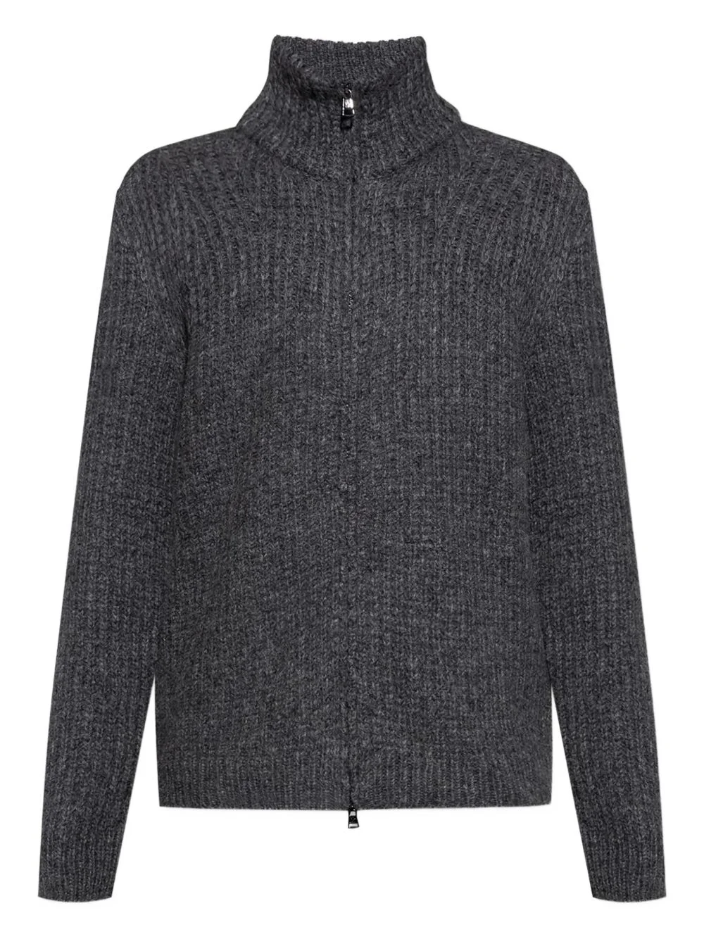 zip-up ribbed cardigan Highlights - Grey - Ribbed knit - Zip fastening - High neck - Logo patch - Long sleeves Imported Composition Alpaca 55%, Wool 23%, Polyamide 22% Washing instructions Do Not Wash/Do Not Dry Clean