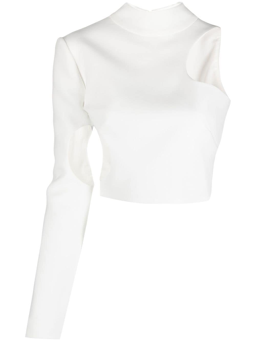 one-shoulder cropped top With this chic mock neck top, Monot's distinctive fashion sense is on full display. Presented here in white, it features sophisticated cut-out detailing, a mock neck and single long sleeve. It's cropped silhouette adds a modern edge. Highlights - White - Mock neck - Cut-out detailing - One-shoulder - Concealed rear zip fastening - Cropped Made in Italy Composition Lining: Polyester 100% Outer: Polyester 100% SIZE & FIT Model measurements Height 5 ft 8 in(1.73 m) Bust/Chest 33.07 in(84 cm) Hips 35.03 in(89 cm) Waist 24.8 in(63 cm)