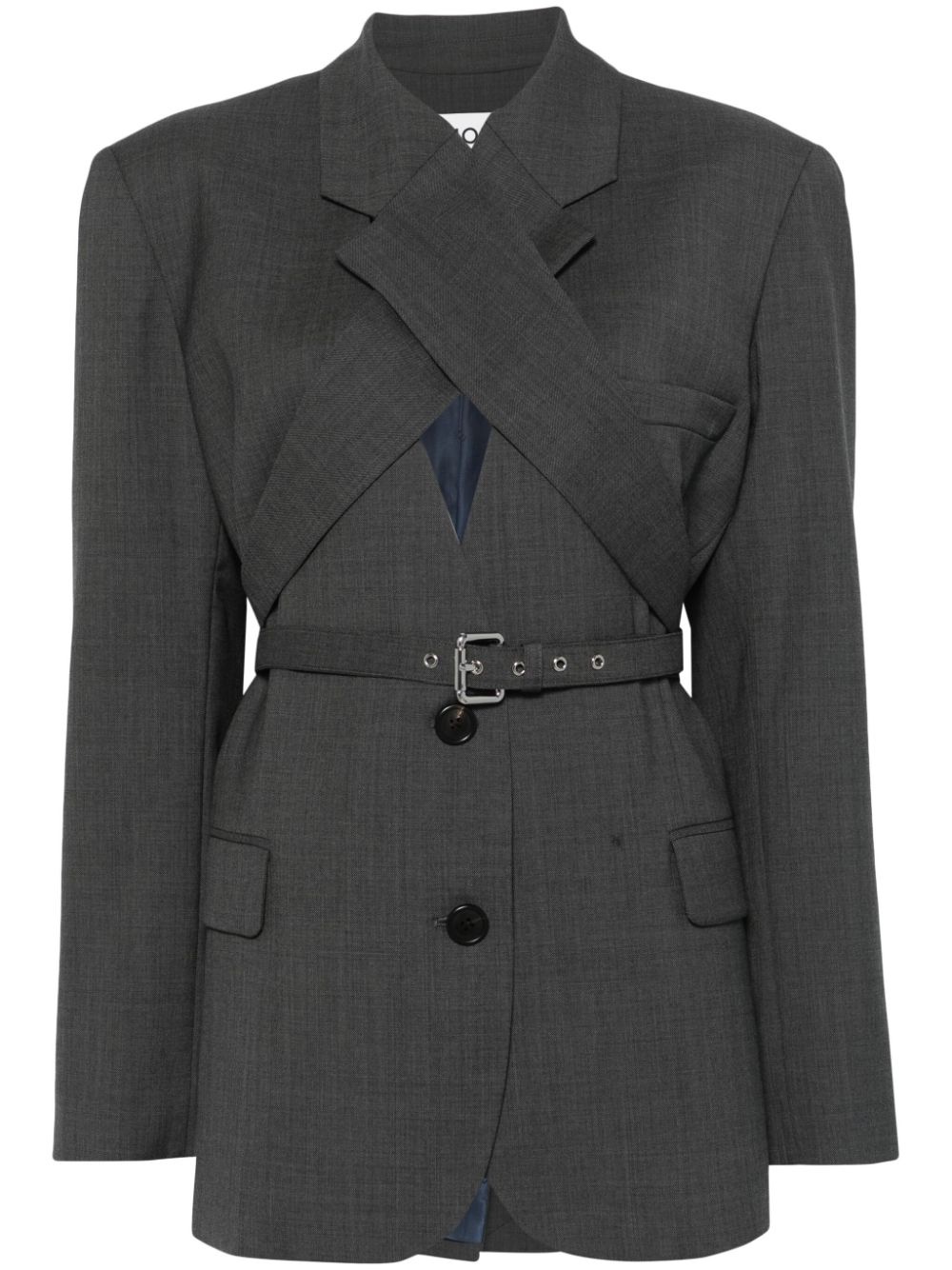 blazer Highlights - Charcoal grey - Stretch-wool - Interlock twill weave - Melange effect - Front button fastening - Buckle fastening - Notched lapels - Shoulder pads - Long sleeves - Buttoned cuffs - Chest welt pocket - Dart detailing - Two front flap pockets - American rear vent - Logo-jacquard lining - Curved hem Made in United States Composition Lining: Cupro 100% Outer: Wool 99%, Elastane 1%