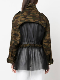 deconstructed camouflage jacket This jacket is emblematic of Monse's deconstructed approach to design. The army-inspired silhoutte and print is unexpectedly accented by sheer panelling to the front and rear for an eccentric finish. Made in United States Composition Nylon 100%, Cotton 100% SIZE & FIT Model measurements Height 5 ft 11 in(1.8 m) Bust/Chest 31.49 in(80 cm) Hips 36.22 in(92 cm) Waist 25.59 in(65 cm) FittingInformation This piece fits true to size. We recommend you get your regular size Cut for a loose fit Made with a mid-weight fabric