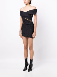 off-shoulder corsed-style dress Highlights - Black - Cotton - Pinstripe pattern - Corset style - Off-shoulder - Transparent panel detail - Thigh-length Made in United States Composition Cotton 100% SIZE & FIT Model measurements Height 5 ft 10 in(1.77 m) Bust/Chest 31.49 in(80 cm) Hips 35.43 in(90 cm) Waist 25.19 in(64 cm) FittingInformation Designed for a very close and sculpting fit Slightly short in length; consider your own measurements