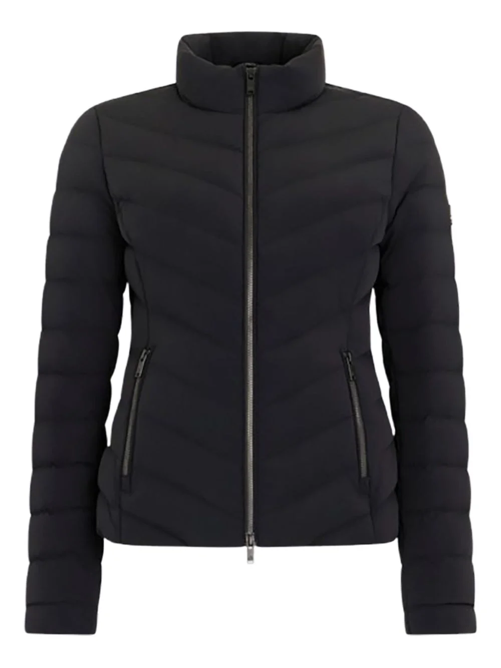 Elora zip-up puffer jacket Highlights - Black - Front two-way zip fastening - High neck - Chevron quilting - Side zip-fastening pockets - Applique logo Imported Composition Nylon 82%, Elastane 18% Washing instructions Read Manufacturer Guidelines