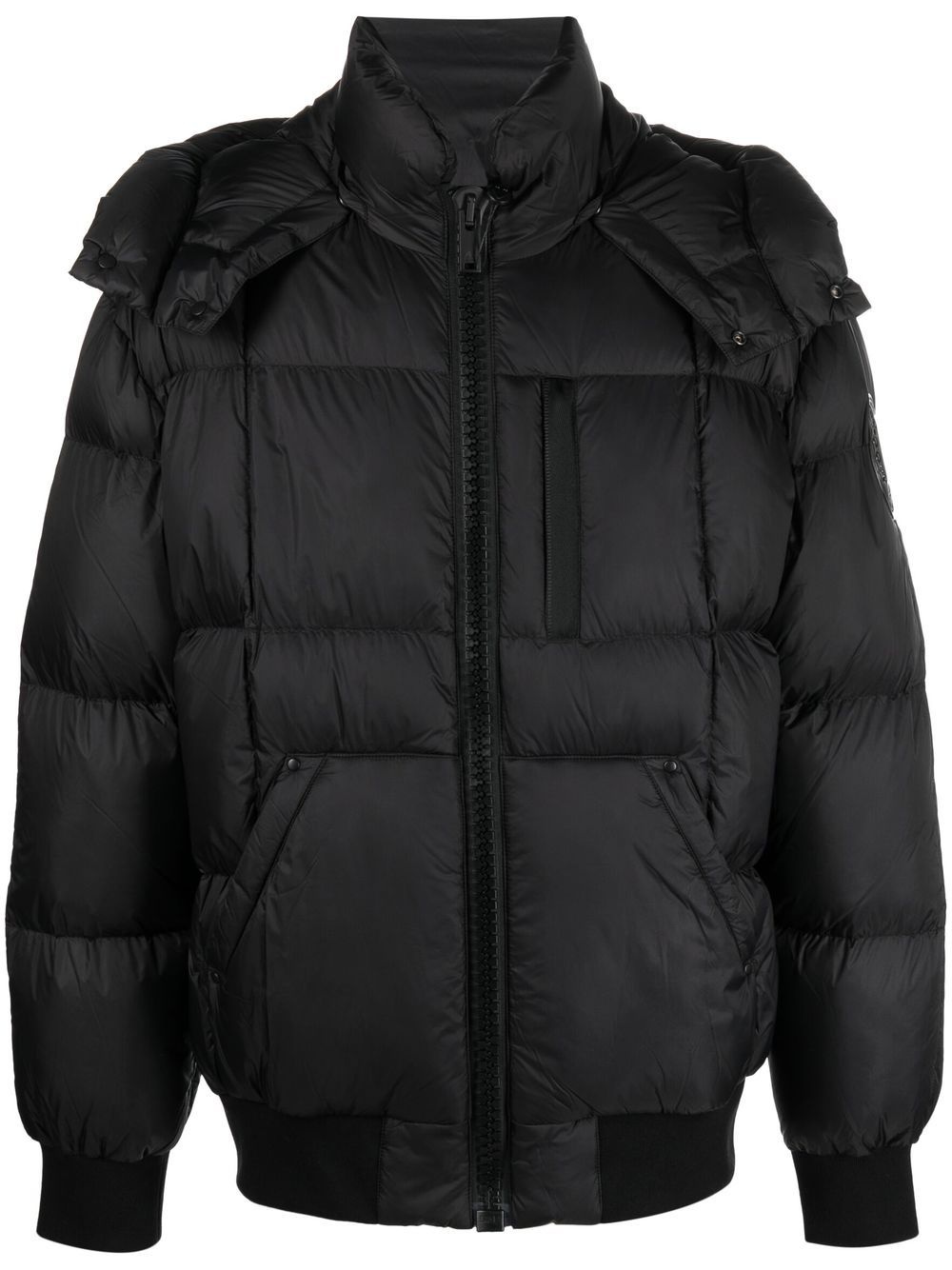 padded zip-ip coat black feather down logo patch at the sleeve front zip fastening classic hood long sleeves Made in Italy Composition Lining: Feather Down 100%, Polyester 100% Outer: Nylon 100% SIZE & FIT Model measurements Height 6 ft 2 in(1.87 m) Bust/Chest 36.41 in(92.5 cm) Hips 37 in(94 cm) Waist 29.52 in(75 cm) FittingInformation This piece fits true to size. We recommend you get your regular size Cut for a loose fit Made with a mid-weight non-stretch fabric Washing instructions Dry Clean Only