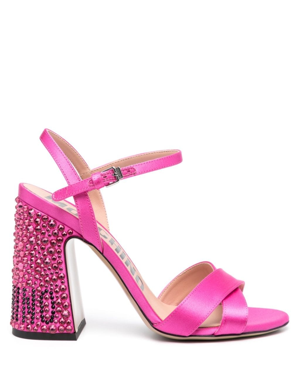 105mm crystal-embellished sandals Towering heights and bold details make up the foundations of Moschino's collections, as epitomised by these satin sandals. Decorated with crystal embellishments, they spell out logo lettering on the heel. Highlights - Fuchsia pink - Satin finish - Round open toe - Crossover strap at the toe - Slingback strap - Branded footbed - Leather lining - 105mm crystal-embellished high block heel - Leather outsole - Logo-engraved silver-tone hardware - Buckle-strap fastening Made in Italy Composition Lining: Calf Leather 100% Outer: Satin 100%, Rhinestone 100% Sole: Calf Leather 100% SIZE & FIT Measurement CIRCUMFERENCE 11.02 in(28 cm) HEEL 4.13 in(10.5 cm) HEIGHT 1.18 in(3 cm)