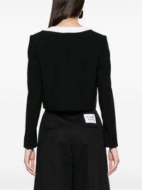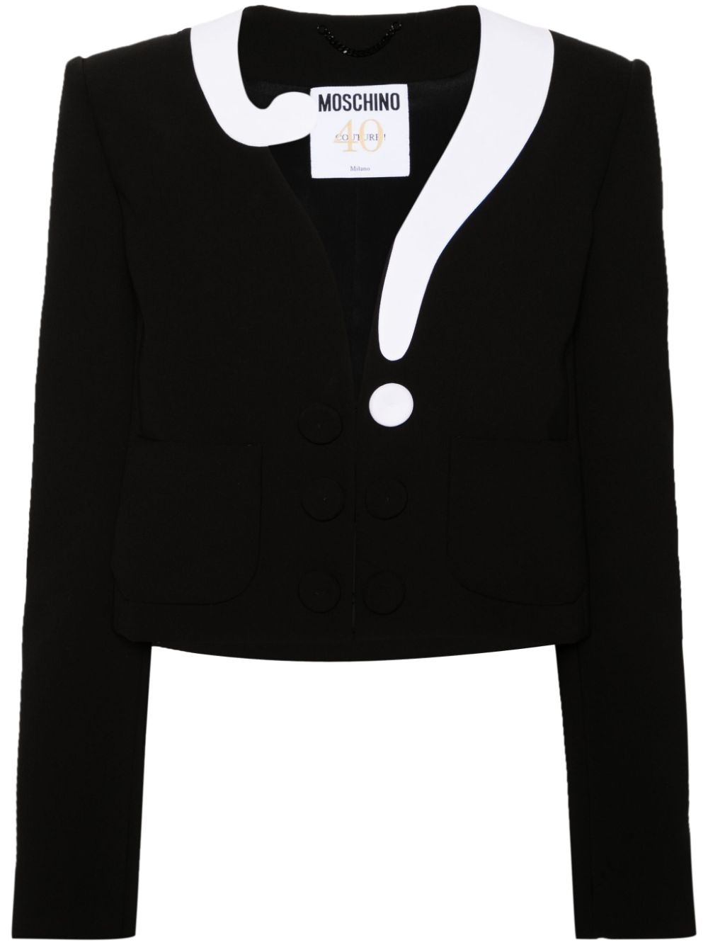 asymmetric-neck cropped jacket Highlights - Black/white - Stretch-design - Question mark motif - Decorative button detailing - Asymmetric neck - Front hook and eye fastening - Shoulder pads - Long sleeves - Buttoned cuffs - Two front patch pockets - Straight hem - Cropped - Full lining Made in Italy Composition Outer: Polyester 88%, Elastane 12% Lining: Acetate 83%, Silk 17% SIZE & FIT Model measurements Height 5 ft 11 in(1.8 m) Bust/Chest 31.49 in(80 cm) Hips 36.22 in(92 cm) Waist 25.59 in(65 cm) FittingInformation Designed for a slim fit that sits just away from the body offering a close yet comfortable fit Cropped in length Made from a midweight non-stretch fabric This piece fits true to size – take your usual size Washing instructions Dry Clean Only