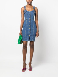 button-up denim minidress blue denim cotton blend front button fastening round neck sleeveless adjustable shoulder straps fitted waistline thigh-length Made in Italy Composition Cotton 99%, Elastane 1% SIZE & FIT Model measurements Height 5 ft 10 in(1.79 m) Bust/Chest 33.07 in(84 cm) Hips 35.03 in(89 cm) Waist 24.4 in(62 cm)