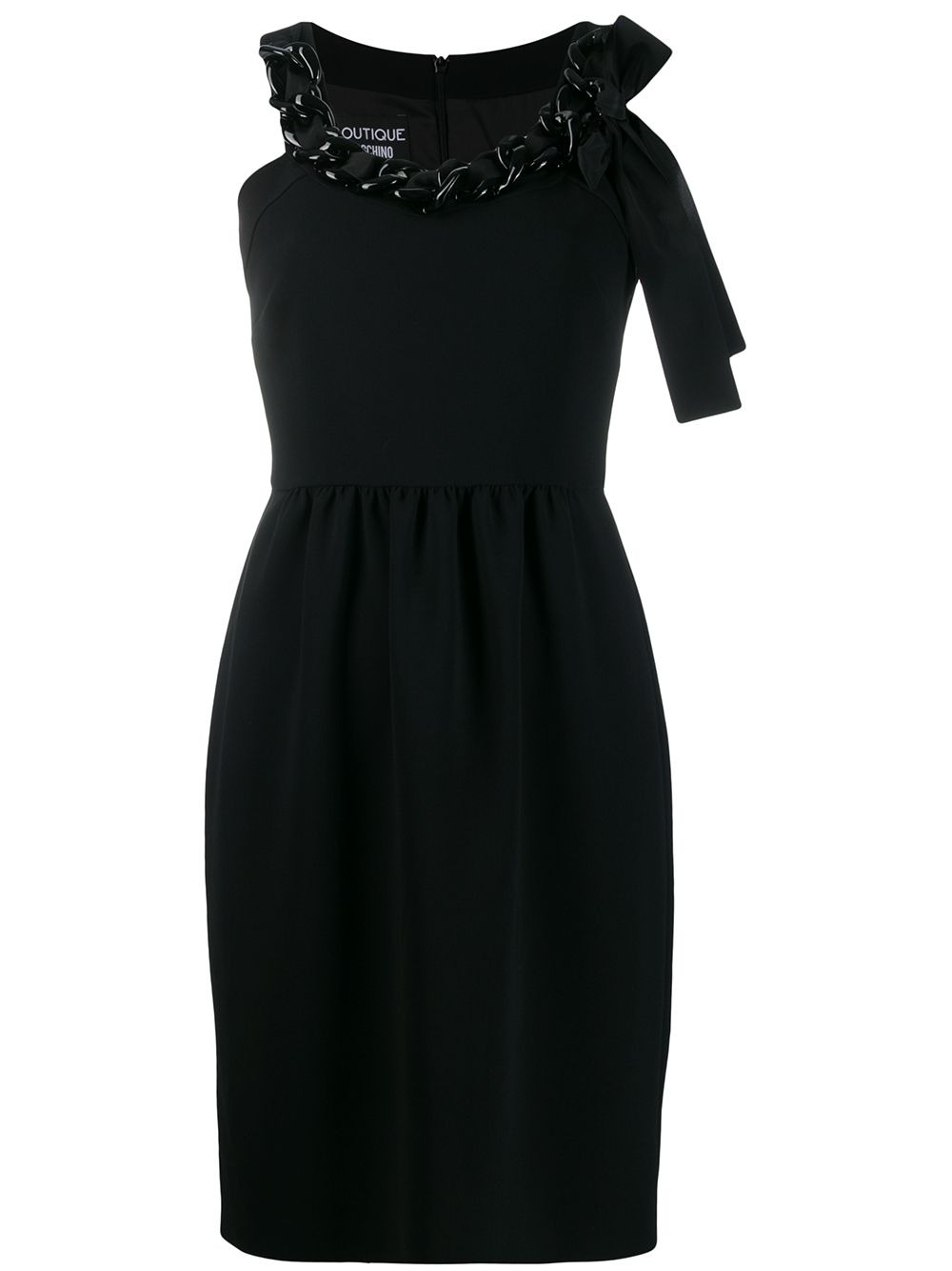 chain-embellished mini dress Black chain-embellished mini dress from Boutique Moschino featuring a round neck, a sleeveless design, a slim fit, a short length and chain and ribbon embellishments. Imported Composition Triacetate 70%, Polyester 30% SIZE & FIT Model measurements Height 5 ft 10 in(1.77 m) Bust/Chest 35.03 in(89 cm) Hips 36.22 in(92 cm) Waist 25.98 in(66 cm) FittingInformation This piece fits true to size. We recommend you get your regular size Designed for a close fit at the bust and waist, but loose at the hip Made with a mid-weight non-stretch fabric Washing instructions Dry Clean Only