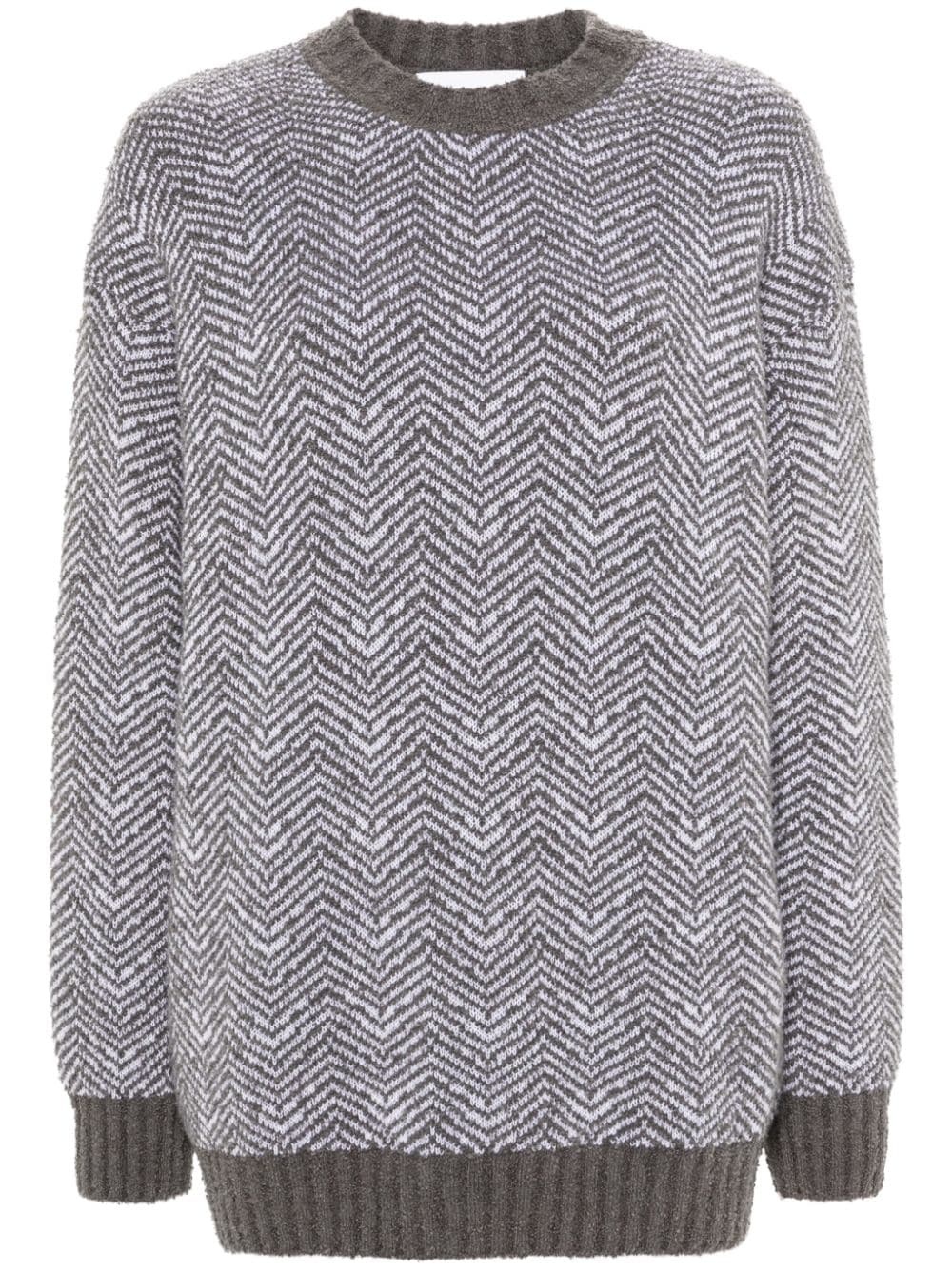 chevron-pattern jumper Highlights - Grey/white - Virgin wool - Knitted construction - Chevron knit - Round neck - Long sleeves - Drop shoulder - Ribbed cuffs and hem - Straight hem Made in Italy Composition Virgin Wool 100%, Cotton 80%, Polyamide 17%, Spandex/Elastane 3% SIZE & FIT Model measurements Height 5 ft 9 in(1.75 m) Bust/Chest 32.67 in(83 cm) Hips 36.22 in(92 cm) Waist 24.8 in(63 cm) FittingInformation Designed to be unstructured, offering a loose fit throughout Made with a midweight knit, this piece offers some stretch This piece fits true to size – take your usual size